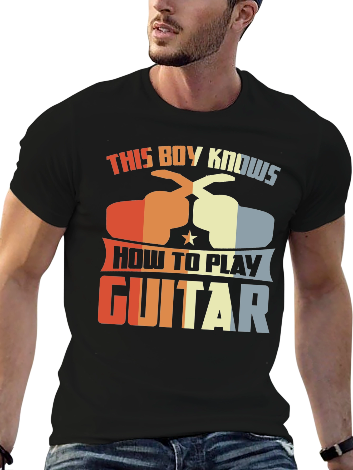 Show off your musical talent with this stylish black t-shirt. The shirt features a retro-inspired graphic design, boasting the phrase "This Boy Knows How To Play Guitar" in vibrant, layered colors. The design also includes an artistic representation of guitar tuning pegs and a star accent. Made from a comfortable fabric, this tee is perfect for casual wear, music lessons, band practice, or rocking out at a concert. A great gift for guitar players, music lovers, or anyone who appreciates a fun, vintage-inspired design.