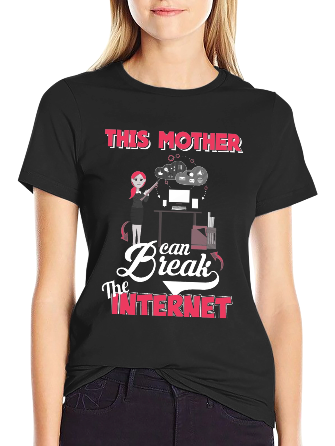 Show off your tech-savvy side with this unique graphic tee! Featuring a bold design with the phrase "This Mother Can Break the Internet", this black t-shirt is perfect for any mom who loves technology. The design includes a fun illustration of a woman with a pointer standing in front of a desk with a computer surrounded by tech symbols. Made from comfortable material, this tee is ideal for casual wear, tech events, or as a humorous gift for the awesome tech mom in your life. Add a touch of geek chic to your wardrobe!