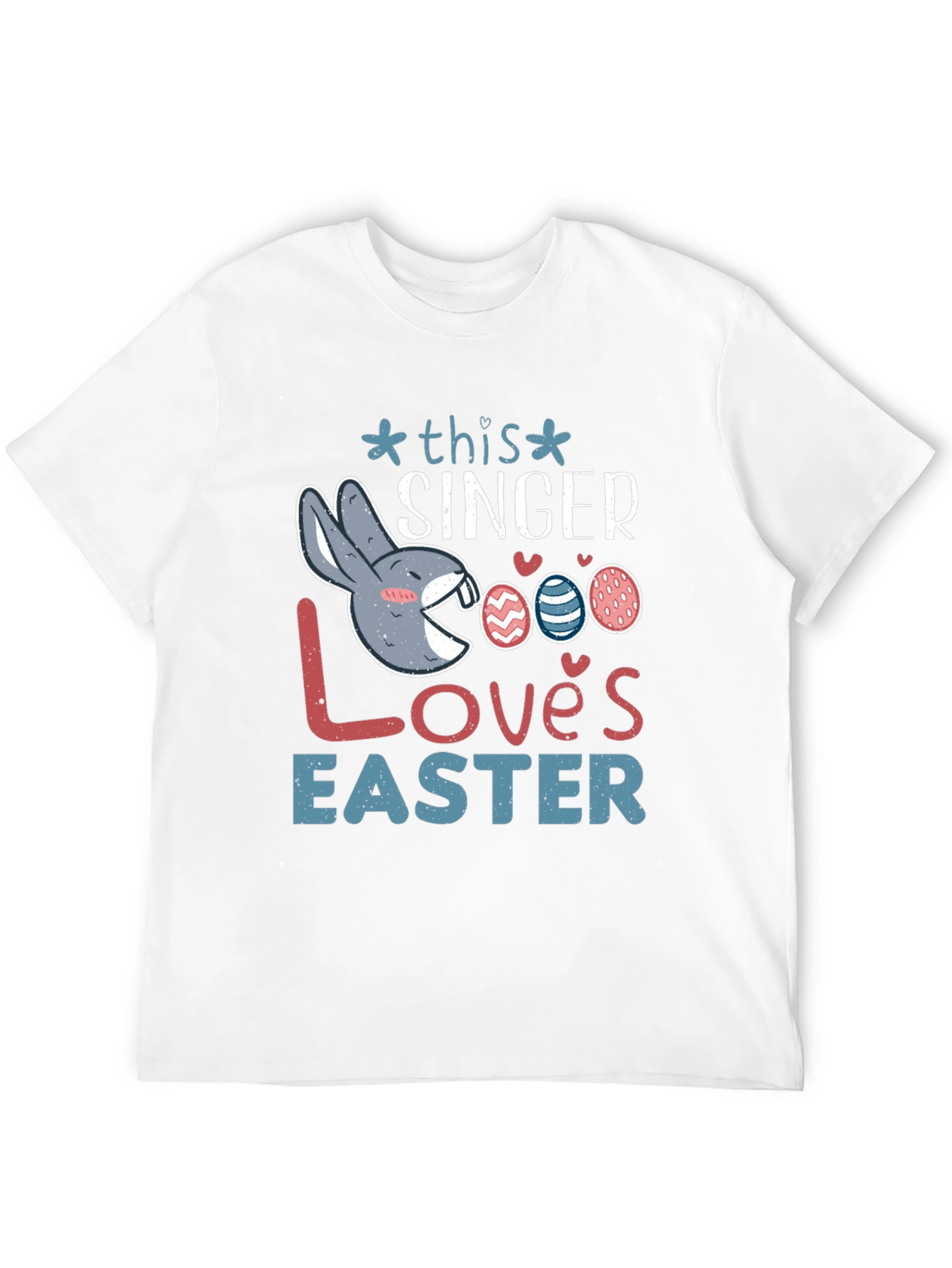 Show off your love for Easter with this cute black graphic tee. The design features a cartoon bunny head and the words 'This Singer Loves Easter' with festive Easter eggs and hearts. Made from comfortable material, this short-sleeved t-shirt is perfect for Easter egg hunts, family gatherings, or casual wear during the spring season. Makes a great gift for the singers who loves Easter!