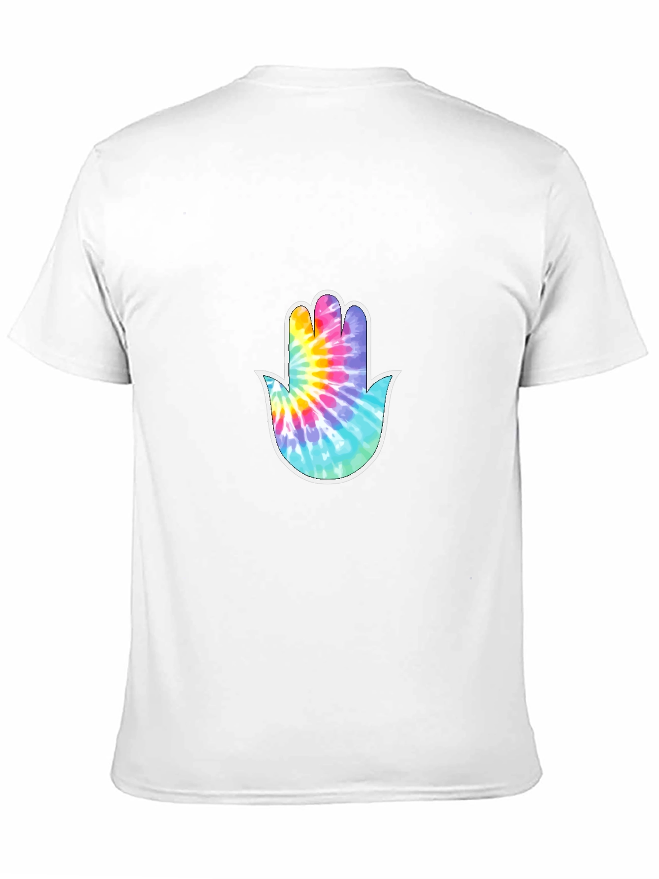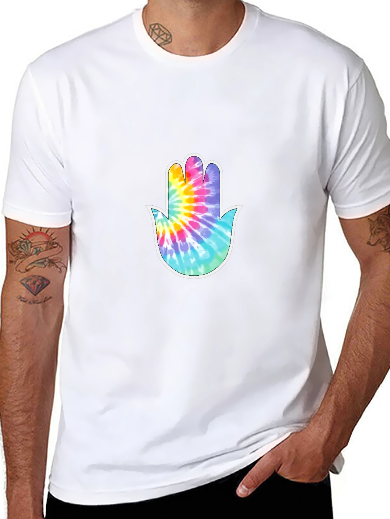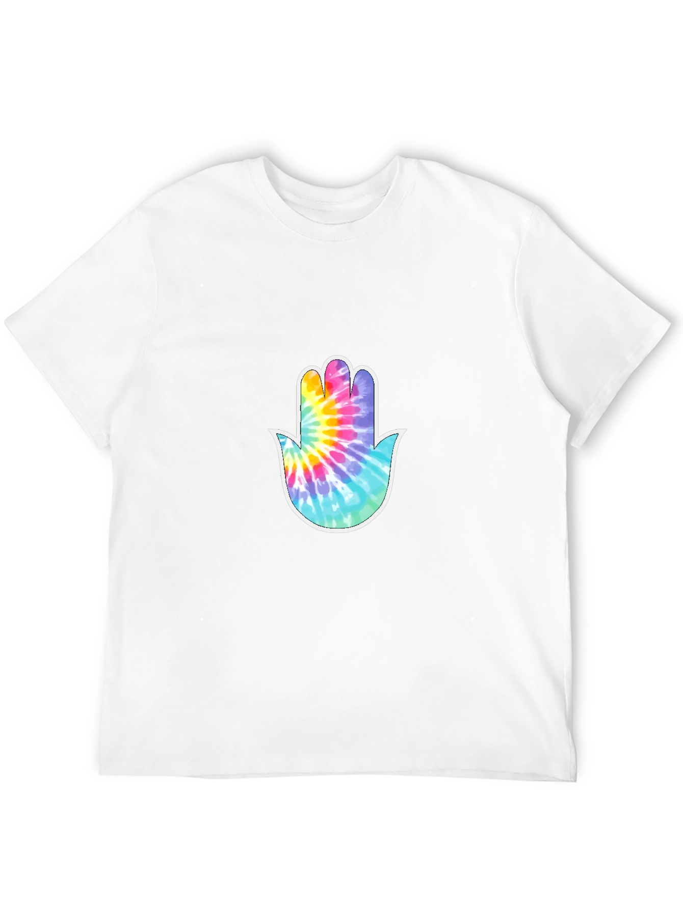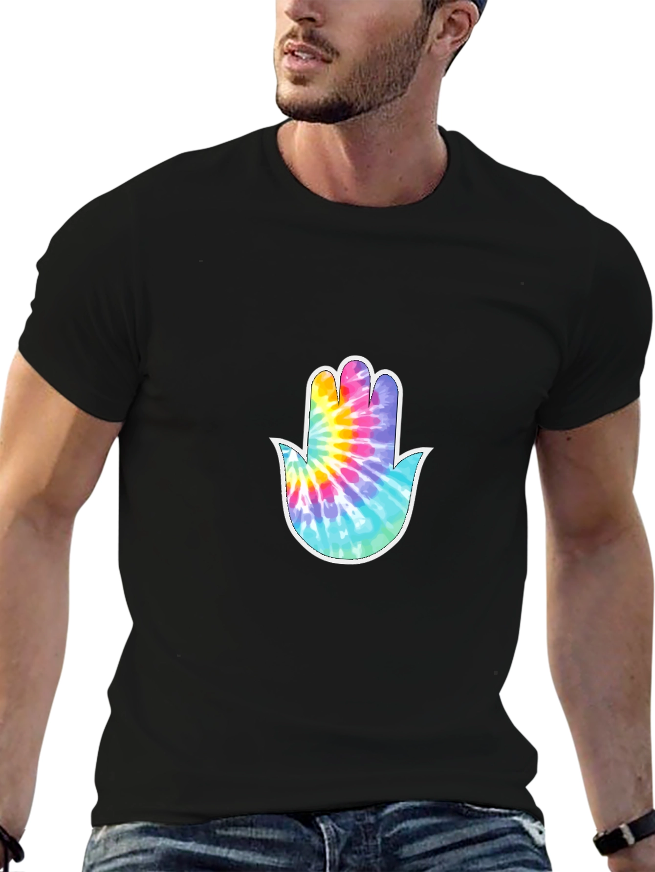 Embrace spiritual style with this eye-catching black t-shirt. Featuring a vibrant, tie-dye Hamsa hand graphic on the chest, this tee offers a unique blend of comfort and cultural expression. The bold colors of the hand design—including shades of pink, blue, and yellow—pop against the classic black backdrop, making it a standout piece. Made from a soft-looking, breathable fabric, this shirt is ideal for everyday wear. Perfect for those who appreciate both fashion and symbolism, it's a versatile addition to any wardrobe. Whether you're going for a casual outing or seeking a comfortable statement piece, this Hamsa hand graphic tee is sure to make a statement.