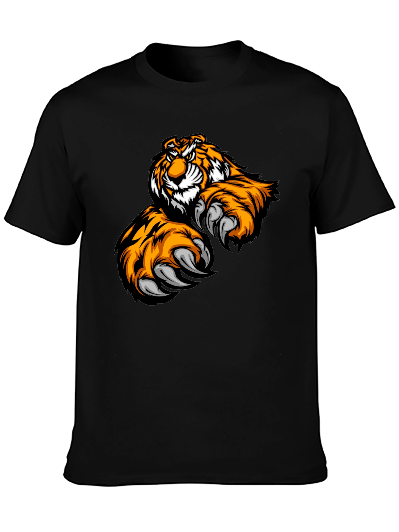 Unleash your inner wildcat with this bold black t-shirt featuring a striking tiger graphic. The design showcases a fierce tiger face with sharp claws, rendered in vibrant orange and black stripes with a contrasting white underbelly. Made from a comfortable-looking fabric, this short-sleeved tee is perfect for everyday wear or making a statement at casual events. Pair it with jeans or shorts for an effortlessly cool look. Show off your edgy style and embrace the power of the tiger with this unique and eye-catching t-shirt. Great for animal lovers and fashion enthusiasts alike!