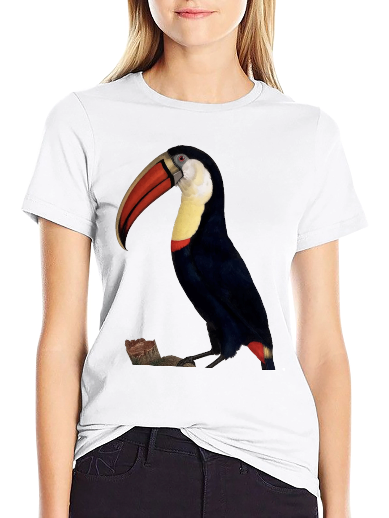 Show off your love for wildlife with this eye-catching black t-shirt. The tee features a vibrant graphic print of a toucan perched on a branch. The toucan's colorful bill and detailed plumage stand out against the dark background of the shirt. Made from a comfortable, breathable fabric, this t-shirt is perfect for casual outings, nature walks, or simply expressing your unique style. Pair it with your favorite jeans or shorts for a cool and relaxed look. A must-have for bird enthusiasts and fashion-forward individuals!