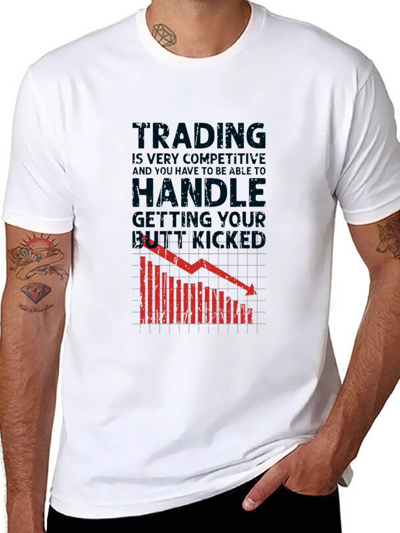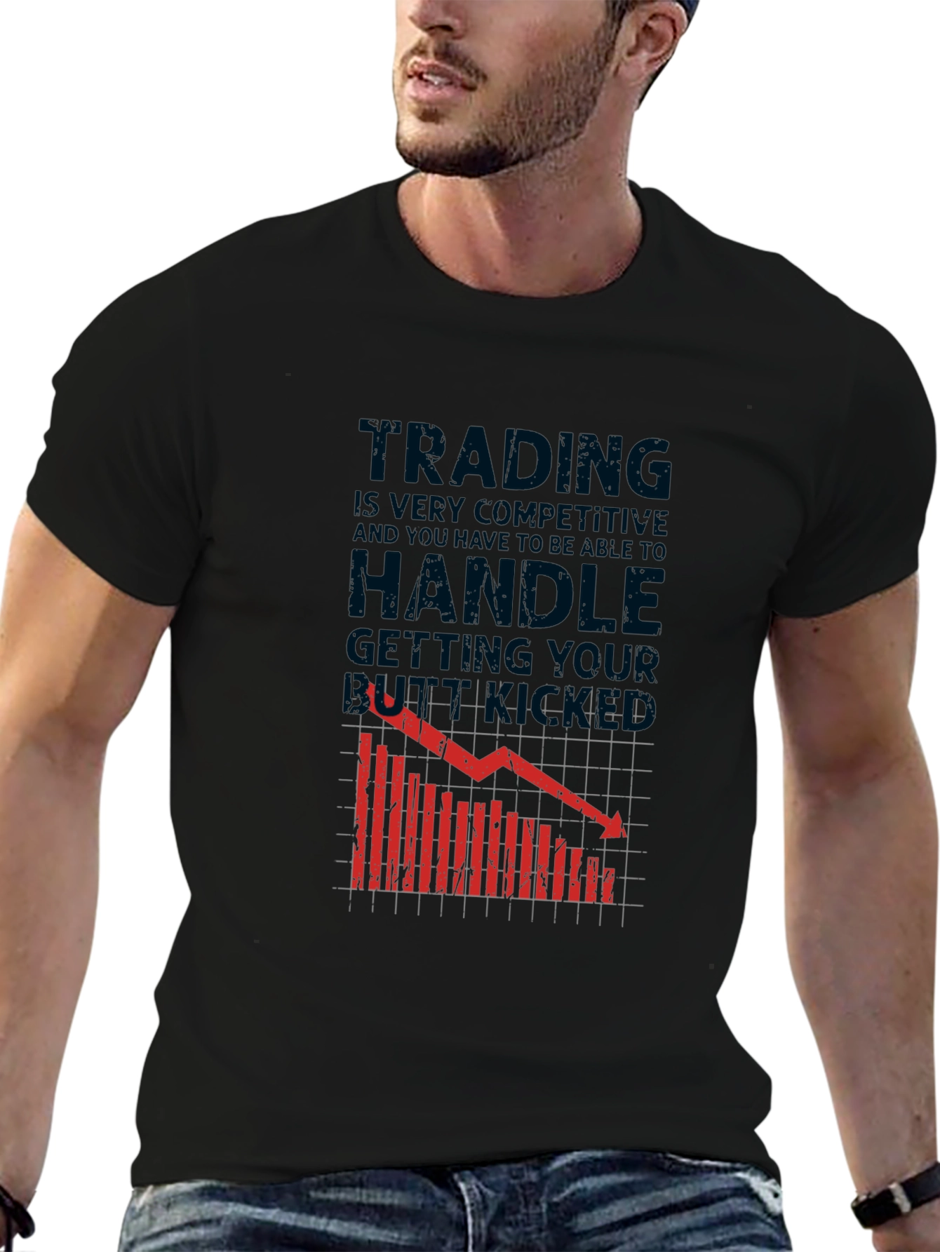 This black t-shirt features a bold graphic design for those involved in trading. The design showcases the phrase "TRADING IS VERY COMPETITIVE AND YOU HAVE TO BE ABLE TO HANDLE GETTING YOUR BUTT KICKED" in a blue, block-style font. A distressed-look red chart with a downward trend adds visual impact and a touch of humor. Made from a soft, breathable fabric, this tee is perfect for casual wear, trading conferences, or as a conversation starter among fellow traders. Show off your passion for the market with this unique and comfortable t-shirt.