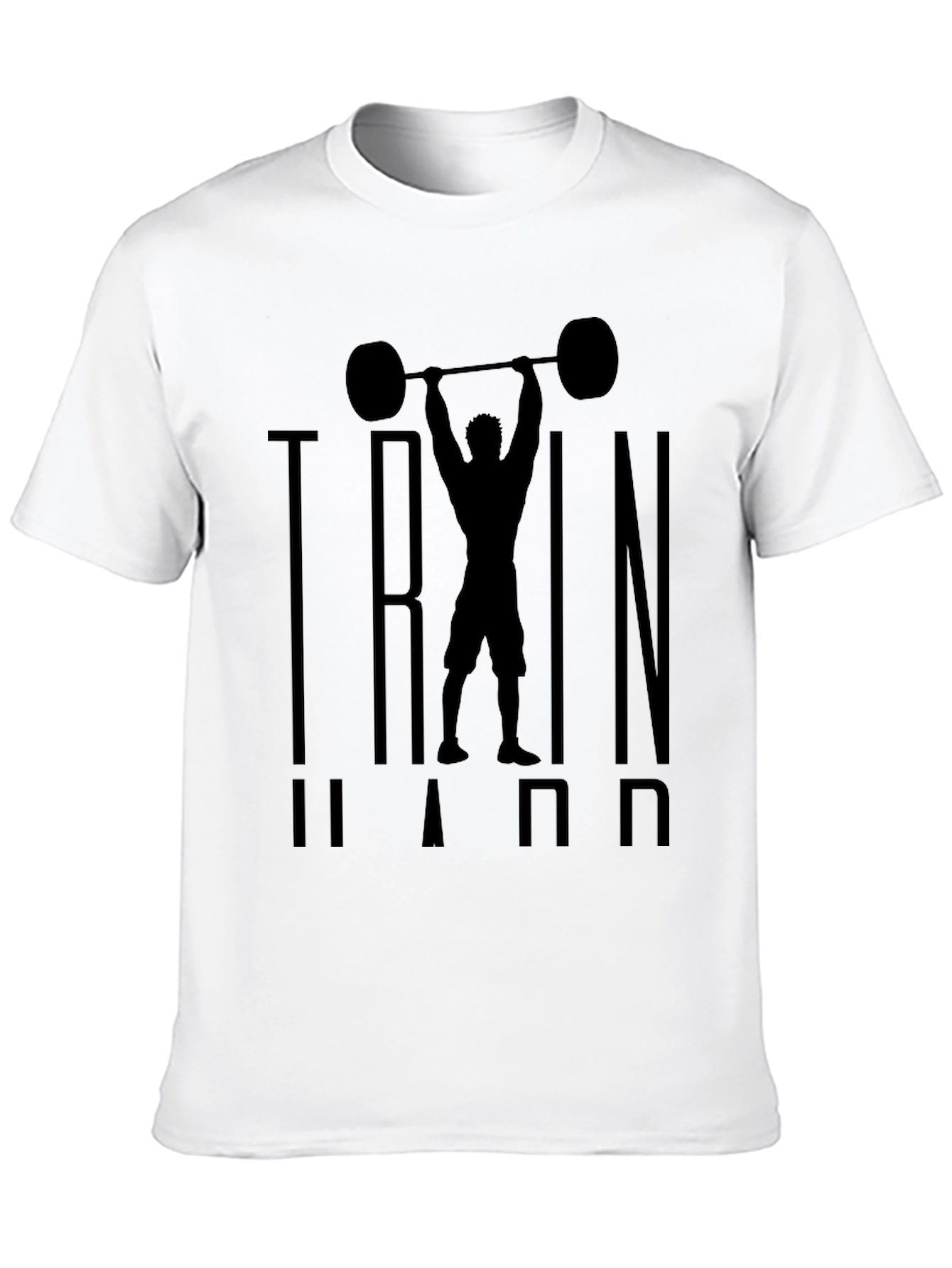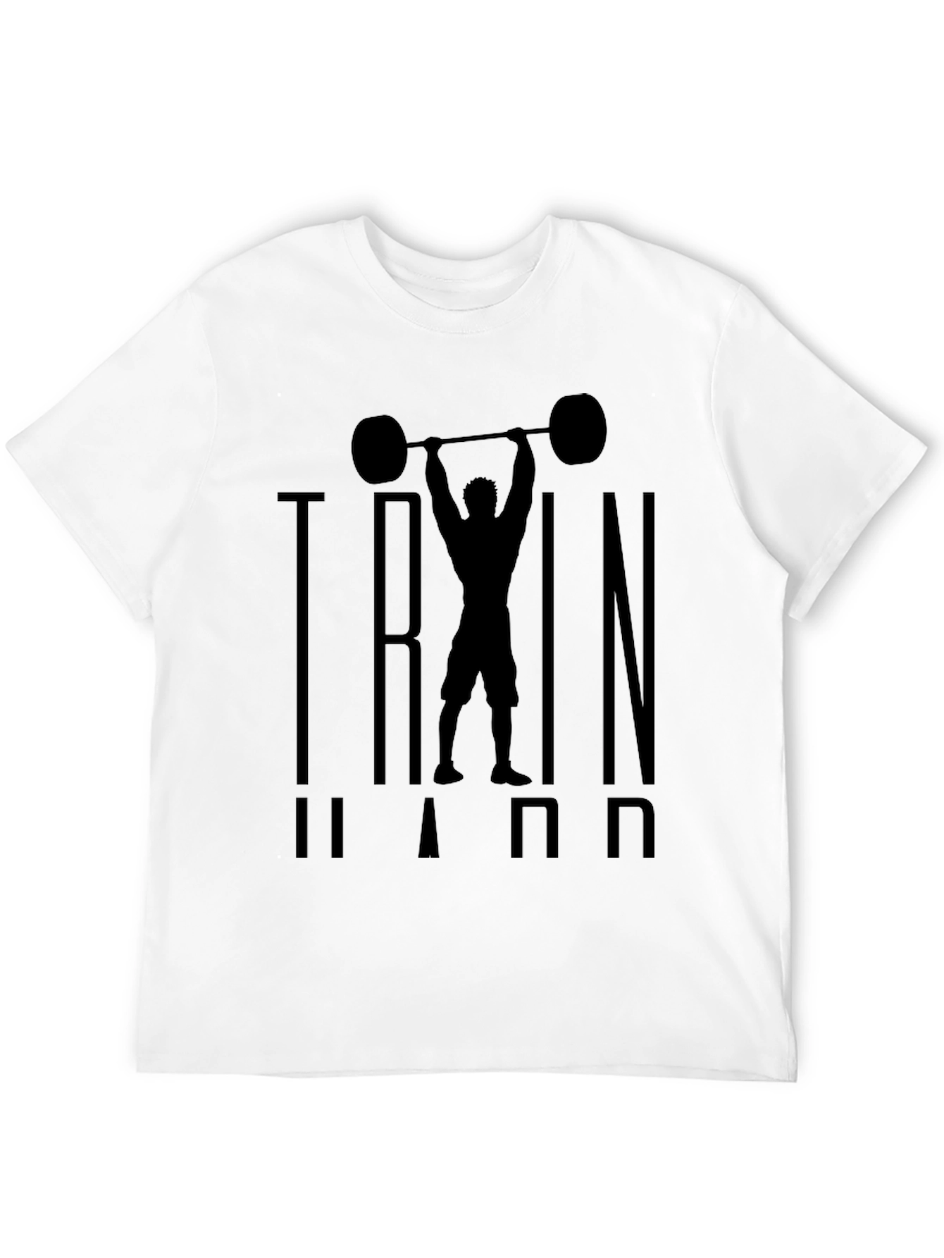 Elevate your workout wardrobe with this striking black graphic tee. The shirt features a bold silhouette of a weightlifter powerfully hoisting a barbell, set against the words "TRAIN HARD" in a strong, vertical design. Made from a comfortable, breathable fabric, this tee is perfect for intense gym sessions or casual wear. Show off your dedication to fitness and make a statement with this eye-catching design. Ideal for weightlifting enthusiasts, fitness lovers, and anyone who embraces an active lifestyle. A must-have addition to any workout wardrobe.