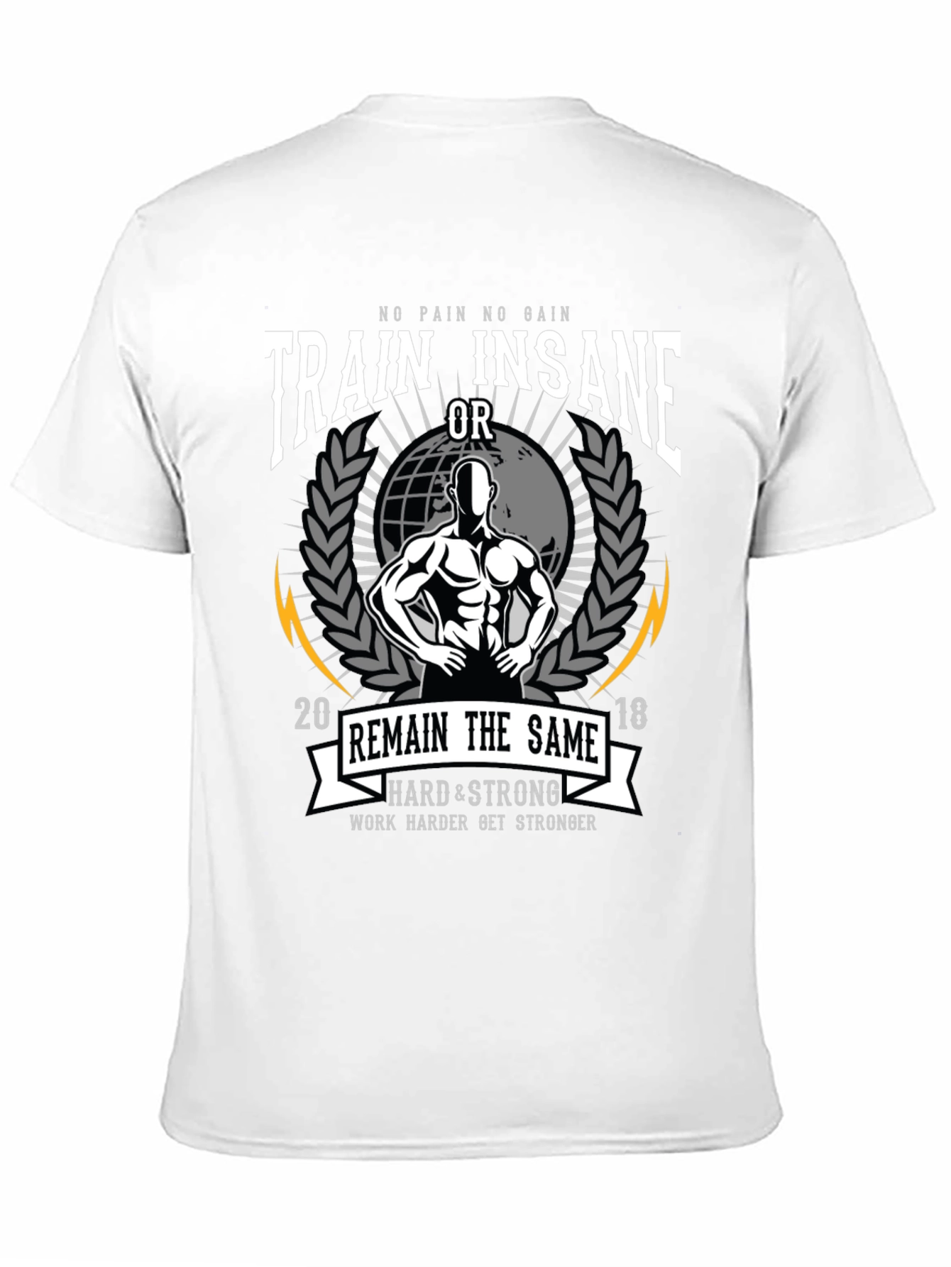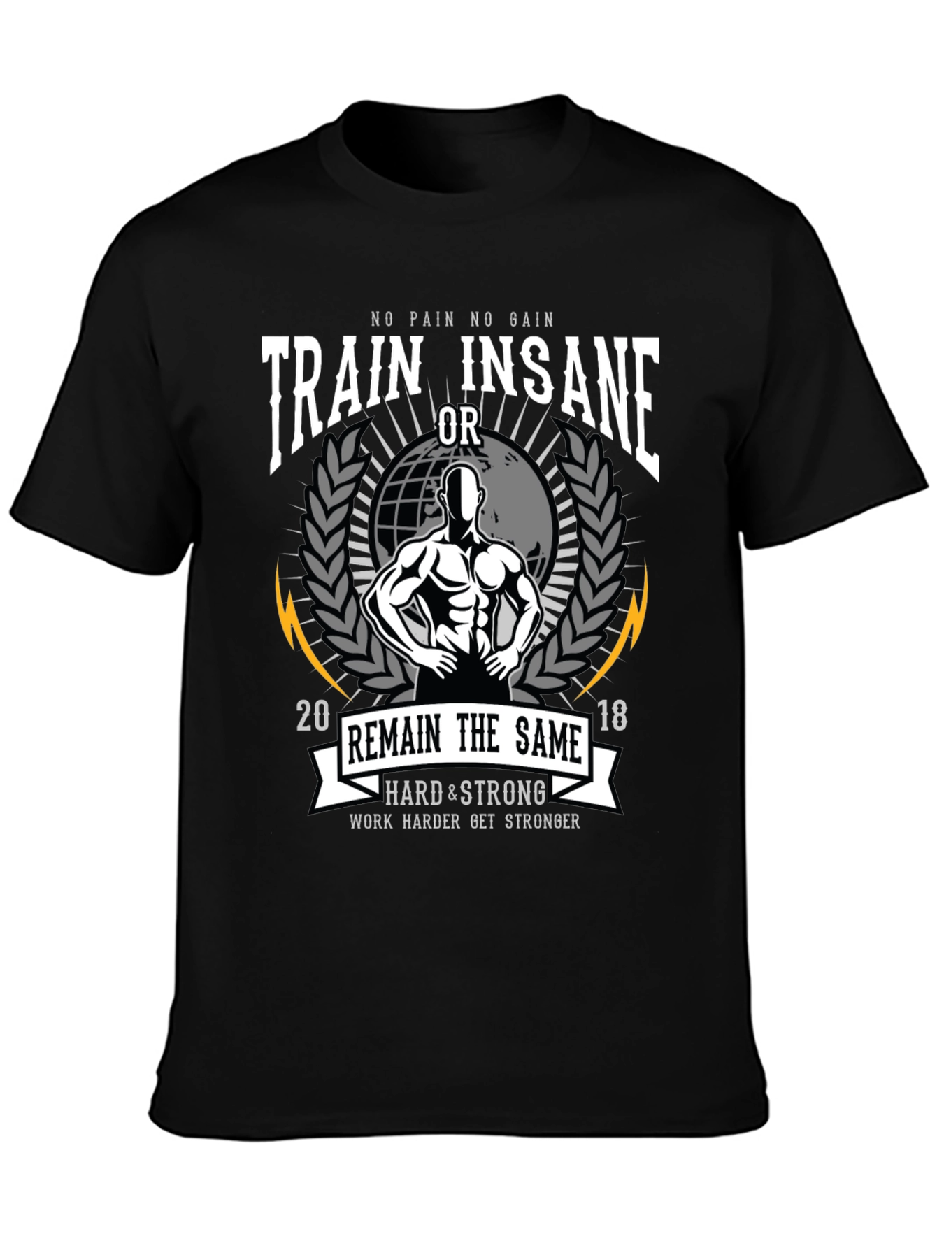 Unleash your inner beast with this striking black graphic tee. Featuring the bold slogan "Train Insane or Remain the Same" and "No Pain No Gain", this shirt embodies dedication and perseverance. The eye-catching design includes a stylized bodybuilder silhouette, surrounded by laurel leaves. This short-sleeved, crew-neck tee is perfect for gym workouts, casual wear, or making a statement about your commitment to fitness. Made from a comfortable fabric blend, this shirt offers a great fit. Show the world your passion for fitness with this motivational graphic tee!
