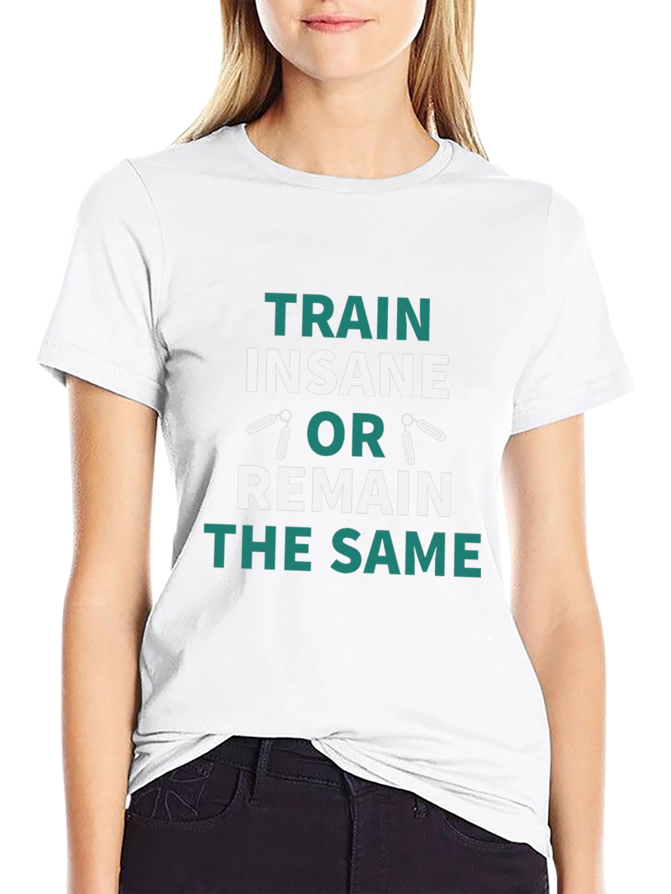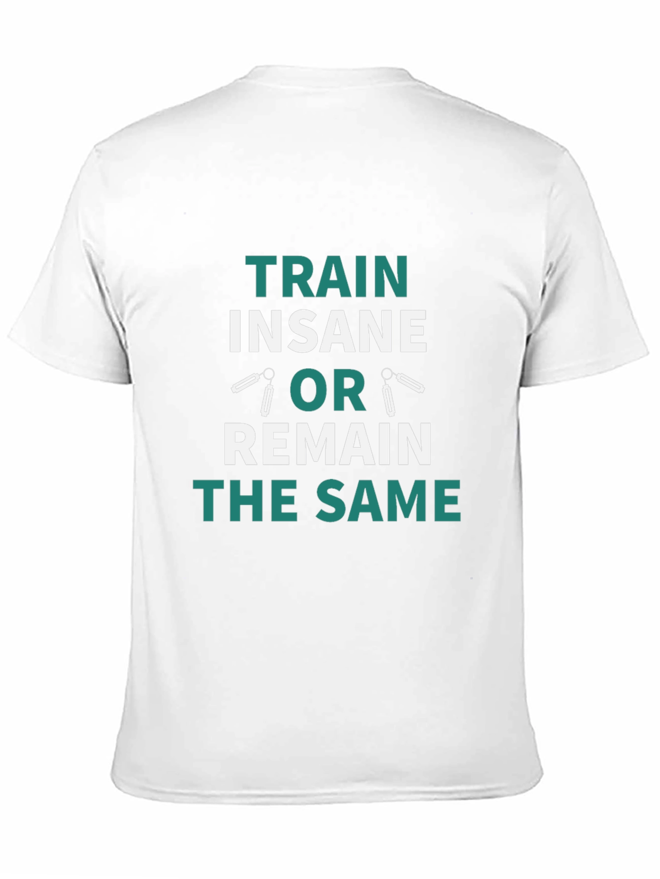Elevate your workout motivation with this striking black t-shirt. Featuring a bold, teal and white graphic that reads 'TRAIN INSANE OR REMAIN THE SAME,' this tee is perfect for fitness enthusiasts. The design incorporates stylized images that resemble weightlifting equipment, adding a unique touch. Made from comfortable material, this shirt is ideal for gym sessions, outdoor activities, or casual wear. Show off your dedication to fitness with this standout t-shirt. Its inspiring message will keep you pushing towards your goals.