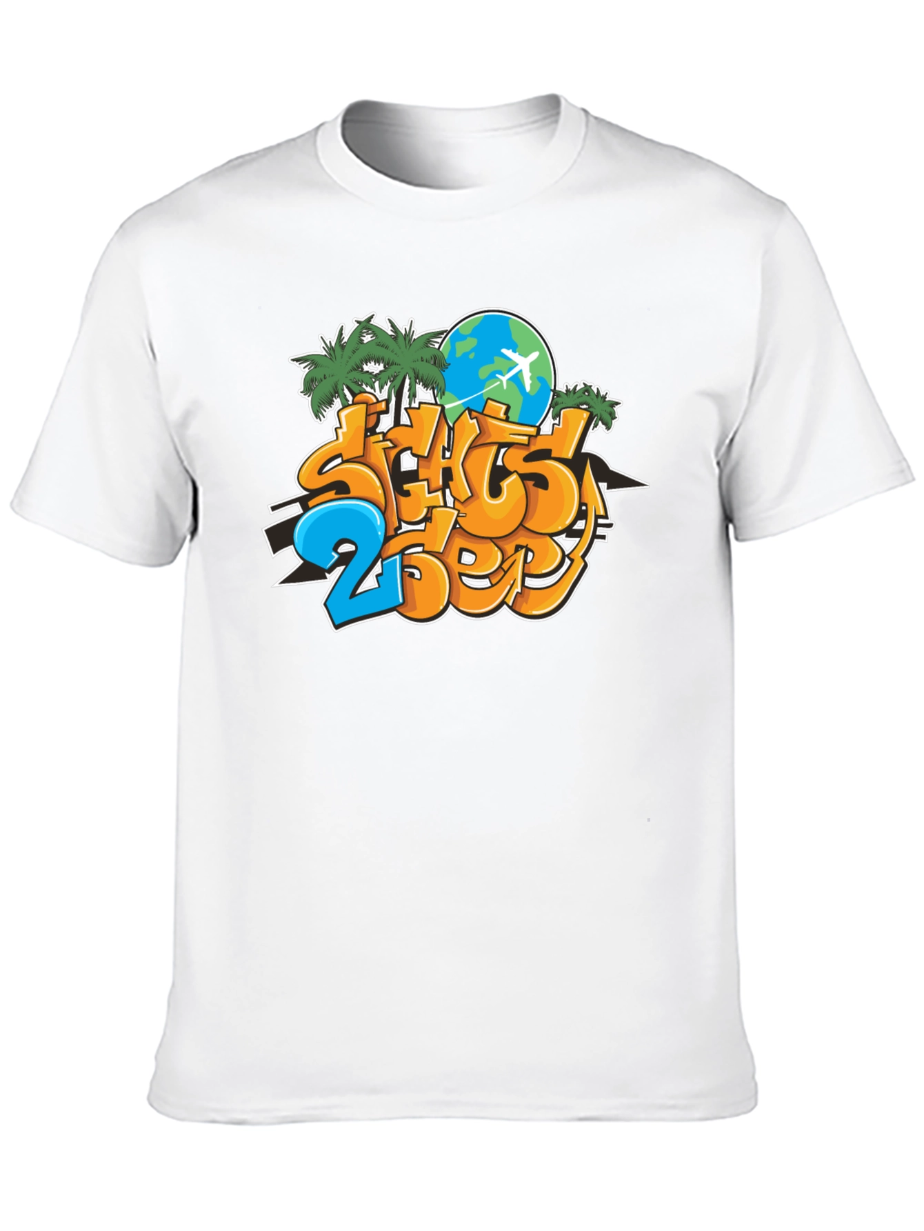 This stylish black t-shirt features a vibrant and eye-catching graphic design. The colorful 'See the World' themed artwork includes images of palm trees, a globe with an airplane, and cool graffiti-style lettering. Made from comfortable-looking fabric, this tee is perfect for casual wear. The design celebrates travel and adventure, making it ideal for globetrotters or anyone dreaming of their next vacation. Stand out from the crowd with this unique and trendy shirt that's sure to spark conversations and showcase your love for exploring the world. Perfect for everyday wear or as a gift for the travel enthusiast in your life.