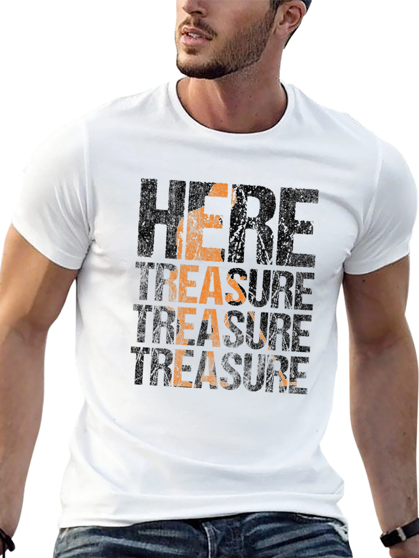 Unearth a unique style with this black graphic tee! Featuring the words "Here" and "Treasure" in a distressed print with a silhouette of a person digging, this tee is perfect for those who love vintage designs with a hint of mystery. The black background of the tee makes the unique graphic stand out. Made from soft, breathable fabric, this t-shirt offers both comfort and style. Wear it casually with jeans or dress it up with a jacket for a night out. This tee is sure to become a wardrobe favorite!