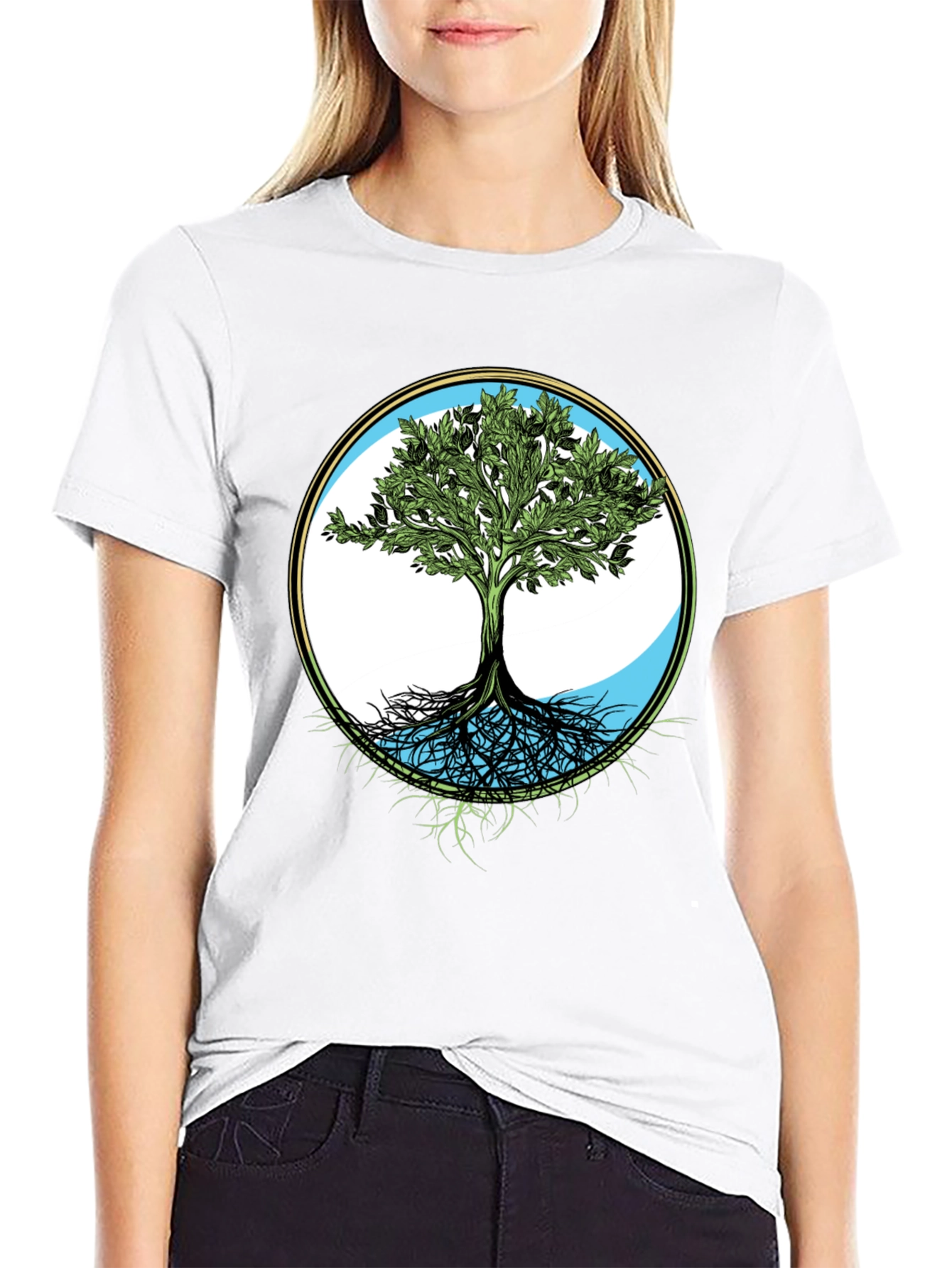 Embrace nature-inspired style with this striking black t-shirt. Featuring a detailed 'Tree of Life' graphic, showcasing a lush green tree with intricate roots, all encased in a stylish circular frame with blue and white accents. Made from a comfortable-looking fabric, this tee offers both style and breathability. The classic fit makes it versatile for casual wear, outdoor adventures, or relaxed weekends. Stand out with this unique and eye-catching design. Perfect for nature lovers and those seeking a touch of artistry in their wardrobe.