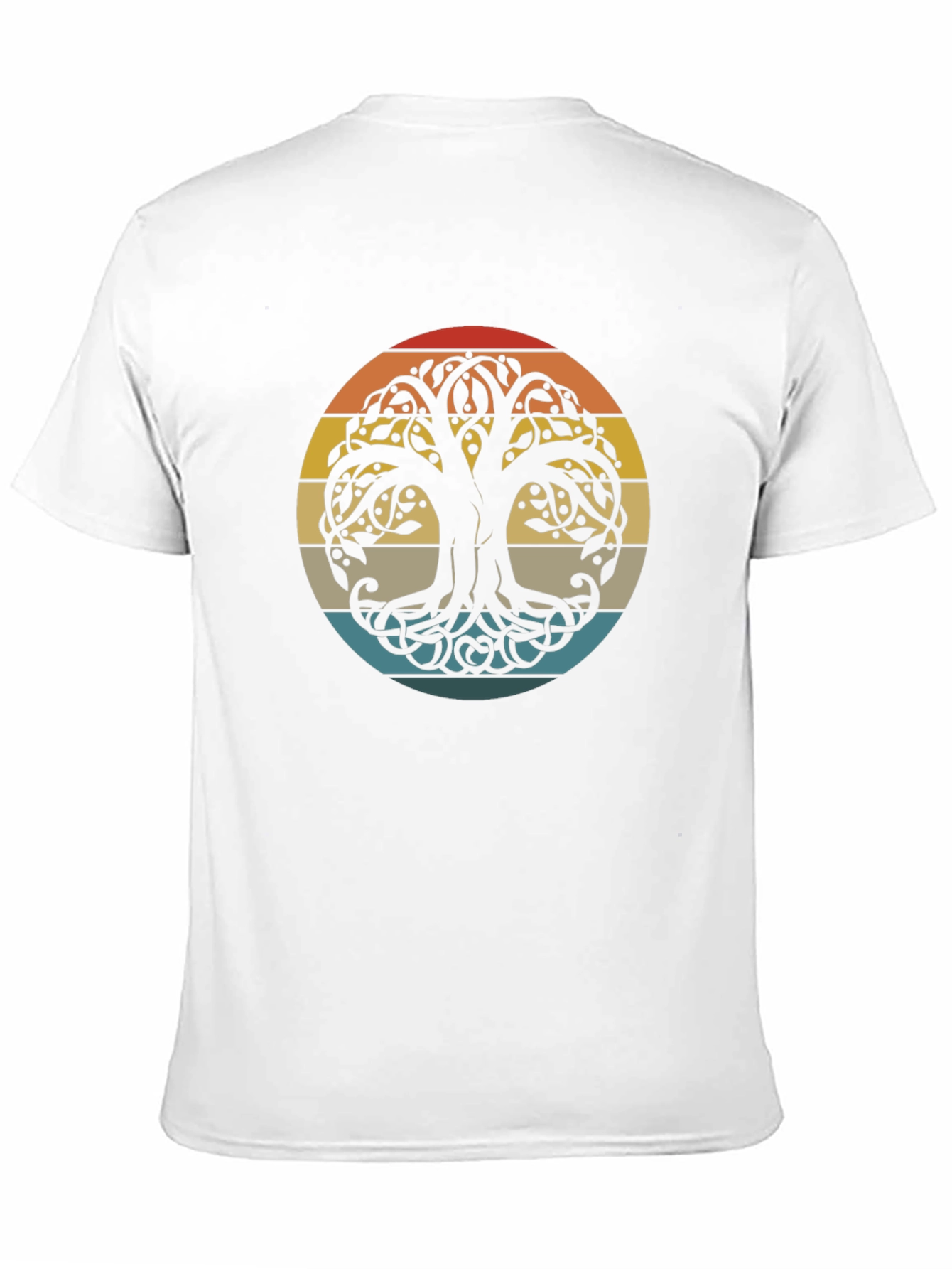 Embrace timeless style with this black graphic tee featuring a vintage-inspired Tree of Life design. The eye-catching circular graphic showcases a detailed tree silhouette against a retro striped background of orange, yellow, and blue hues. This classic short-sleeve tee is made from a comfortable and durable material, perfect for everyday wear. Its unique design makes it a standout piece, ideal for casual outings, nature enthusiasts, or anyone looking to add a touch of artistic flair to their wardrobe. Pair it with jeans or shorts for a relaxed yet stylish look.
