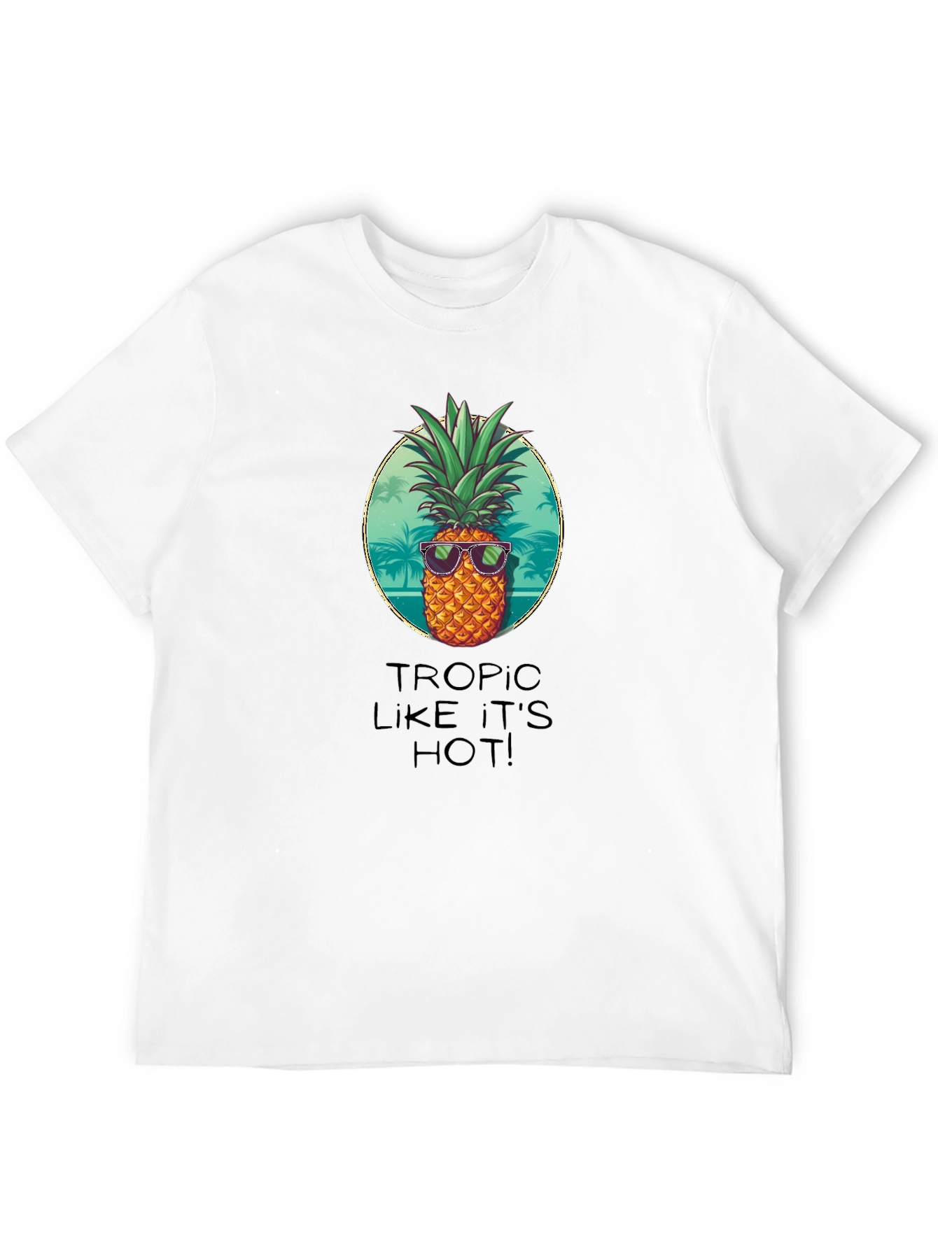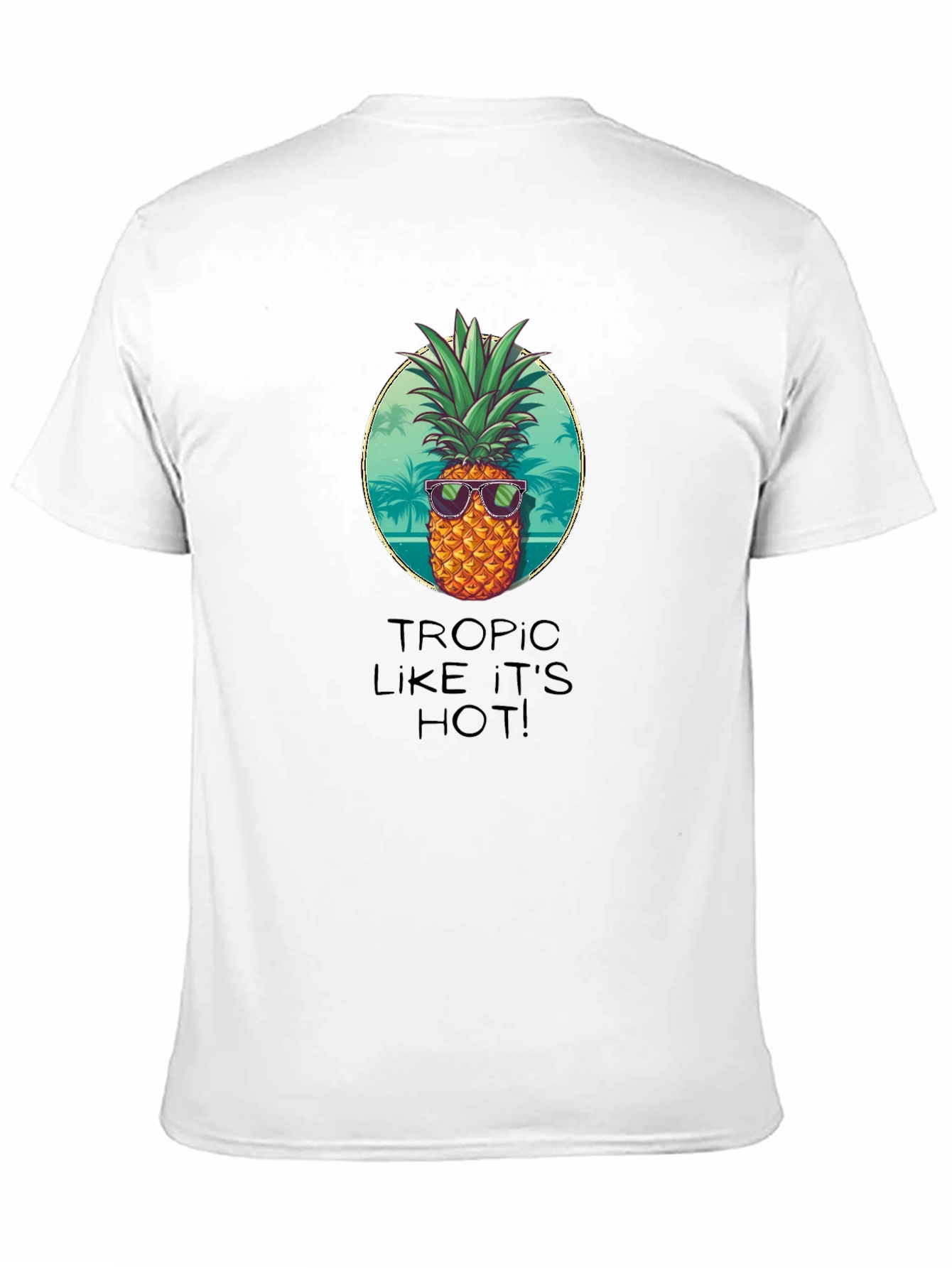 Embrace the summer vibes with this stylish black t-shirt featuring a fun pineapple graphic. The design showcases a cool pineapple wearing sunglasses, set against a tropical backdrop. Below, the phrase 'Tropic Like It's Hot!' adds a playful touch. Made from comfortable fabric, this tee is perfect for casual wear, beach outings, or summer parties. Pair it with shorts or jeans for a relaxed yet trendy look. Express your love for tropical style with this unique and eye-catching t-shirt!