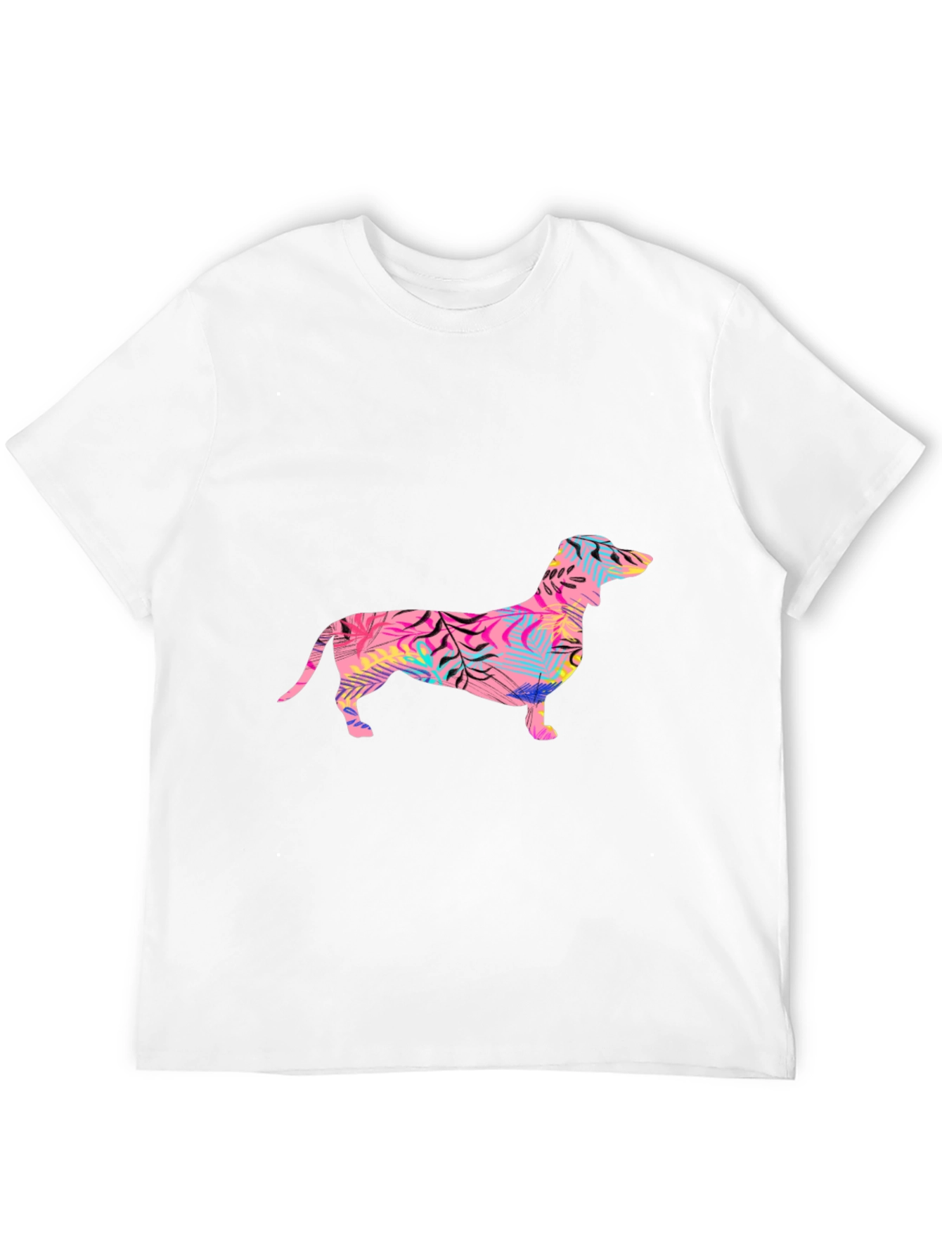 Embrace vibrant style with this men's black t-shirt featuring a unique tropical dachshund graphic. The playful design showcases a dachshund silhouette filled with colorful palm leaves and floral patterns. Crafted from a soft, breathable fabric, this tee offers both comfort and standout style. Perfect for casual outings, dog lovers, or anyone seeking a bold, eye-catching look. Pair it with jeans, shorts, or layer it under a jacket for versatile styling options. Elevate your wardrobe with this statement piece that blends comfort and artistic flair.