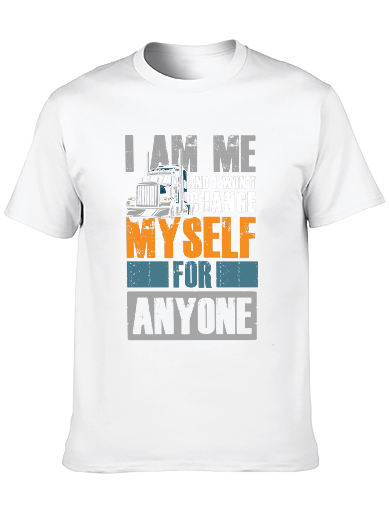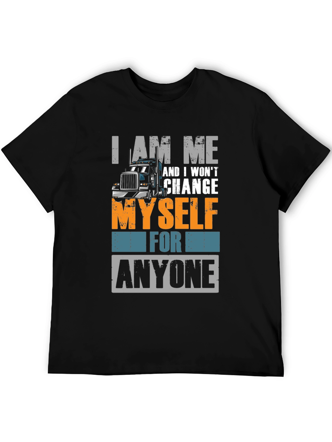 Show your trucker pride with this bold and stylish black t-shirt. The design features a powerful message: "I AM ME AND I WON'T CHANGE MYSELF FOR ANYONE." A striking graphic of a semi-truck adds to the statement. The design incorporates orange, blue, and gray accents for a visually appealing look. Made from a comfortable material, this tee is perfect for casual wear. It's a great way to express your individuality and love for the open road. Be authentic with this unique statement tee!