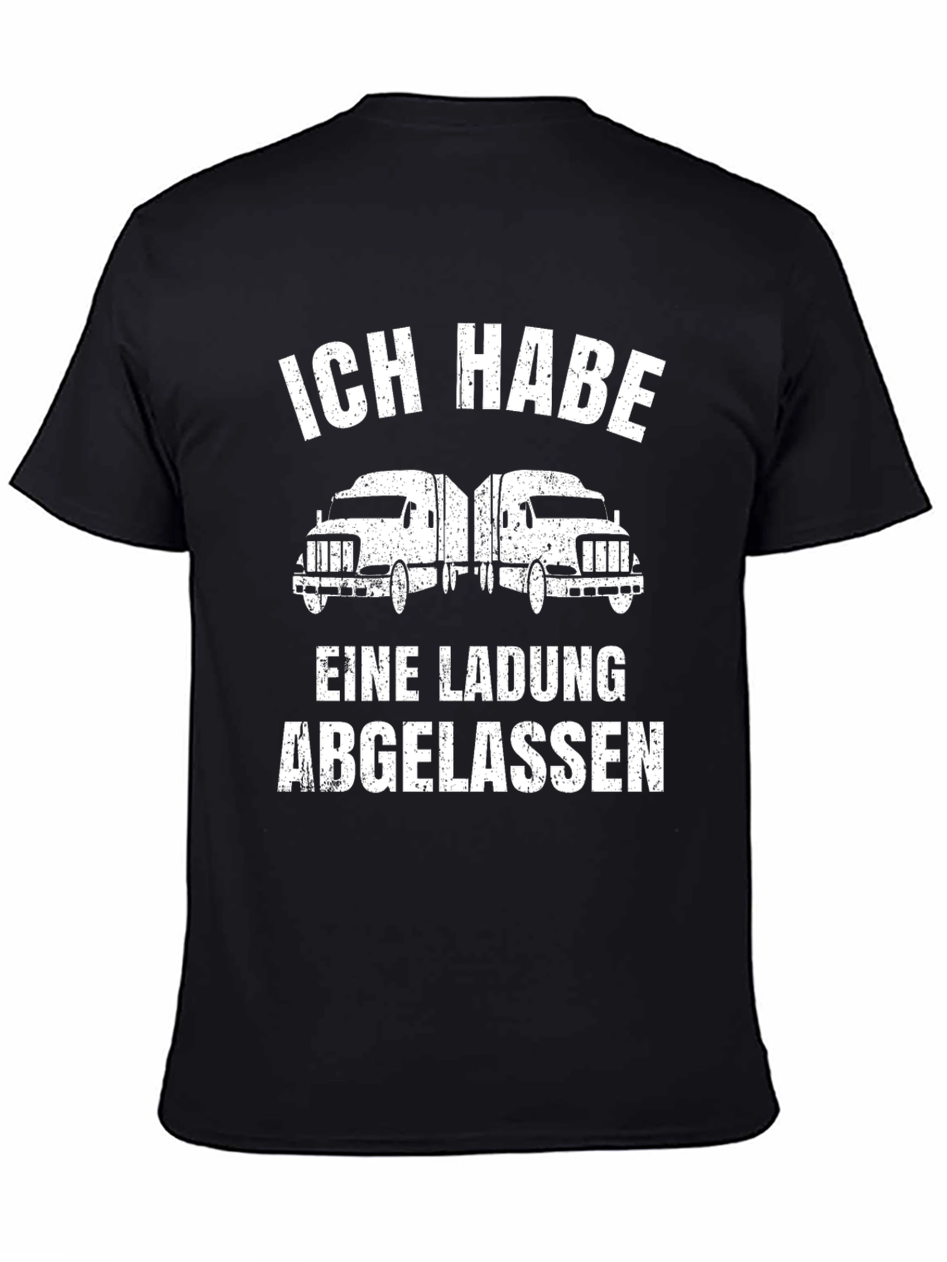 This black t-shirt features a bold design that's perfect for truckers and those who appreciate the open road. The shirt showcases two stylized semi-trucks accompanied by the phrase "Ich Habe Eine Ladung Abgelassen" in eye-catching white lettering. Made from a soft-looking fabric, this tee offers both comfort and style for everyday wear. Its classic fit makes it ideal for casual outings, truck stops, or simply relaxing at home. Show off your love for trucking with this unique and expressive t-shirt that speaks volumes without saying too much.
