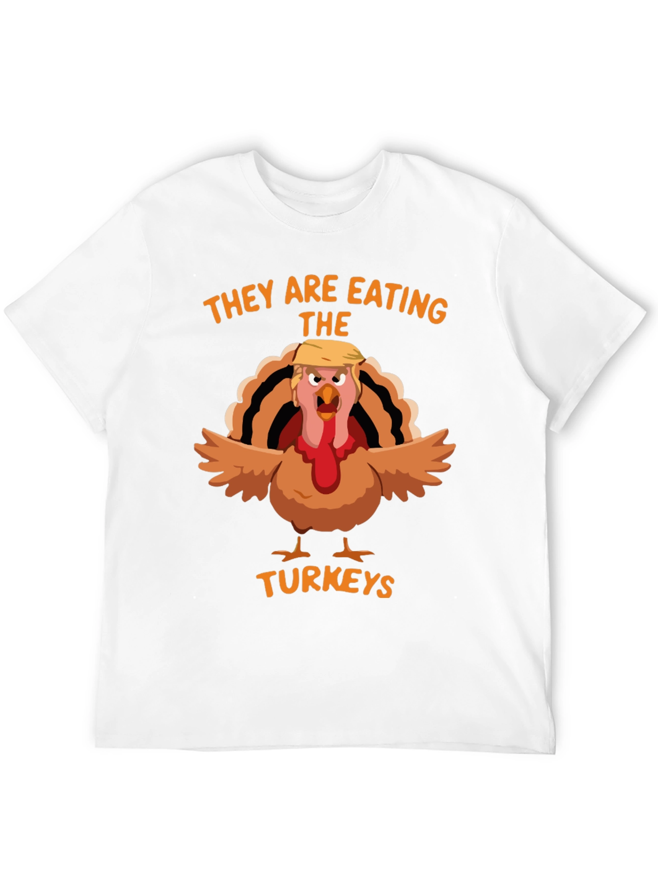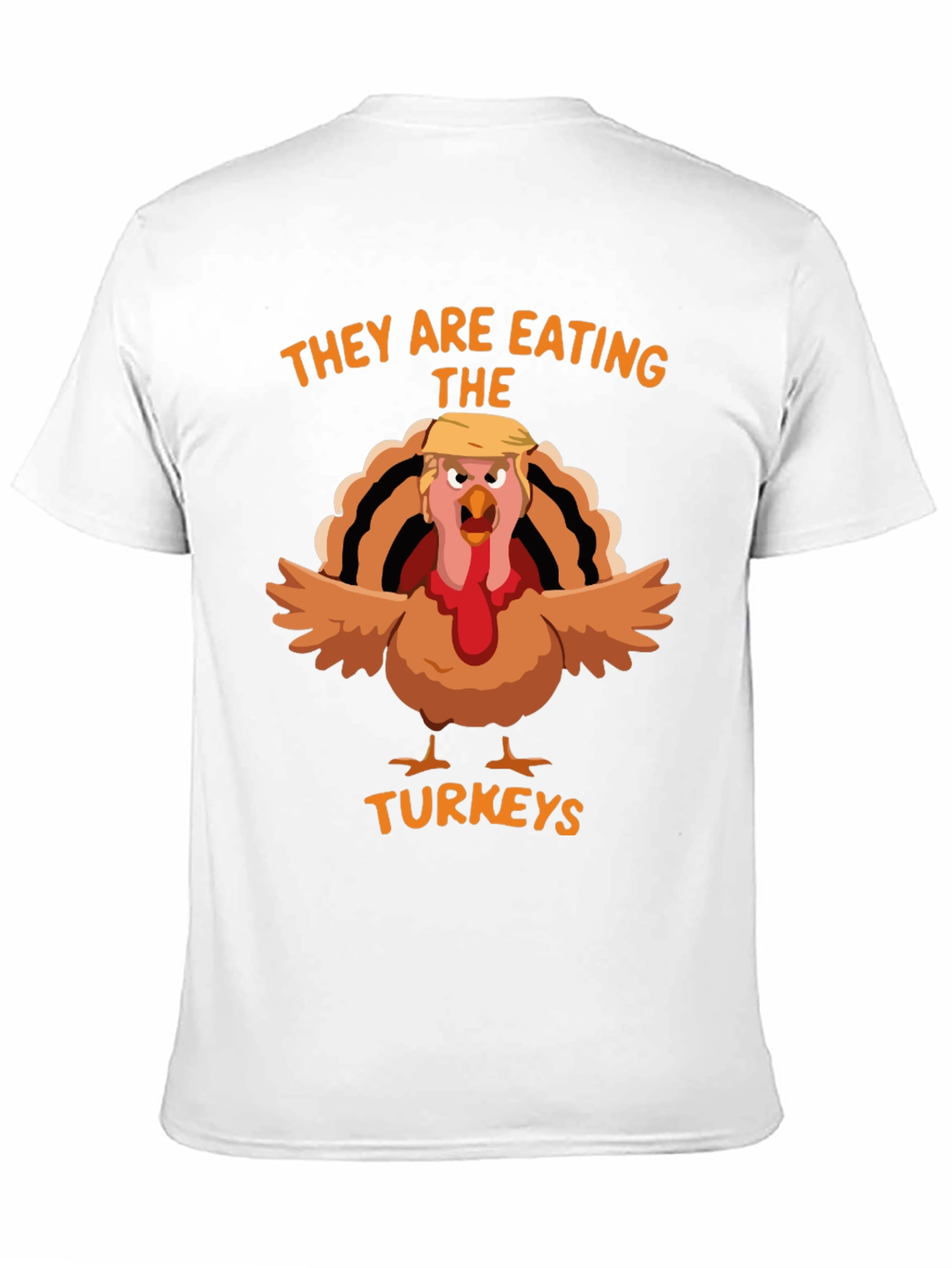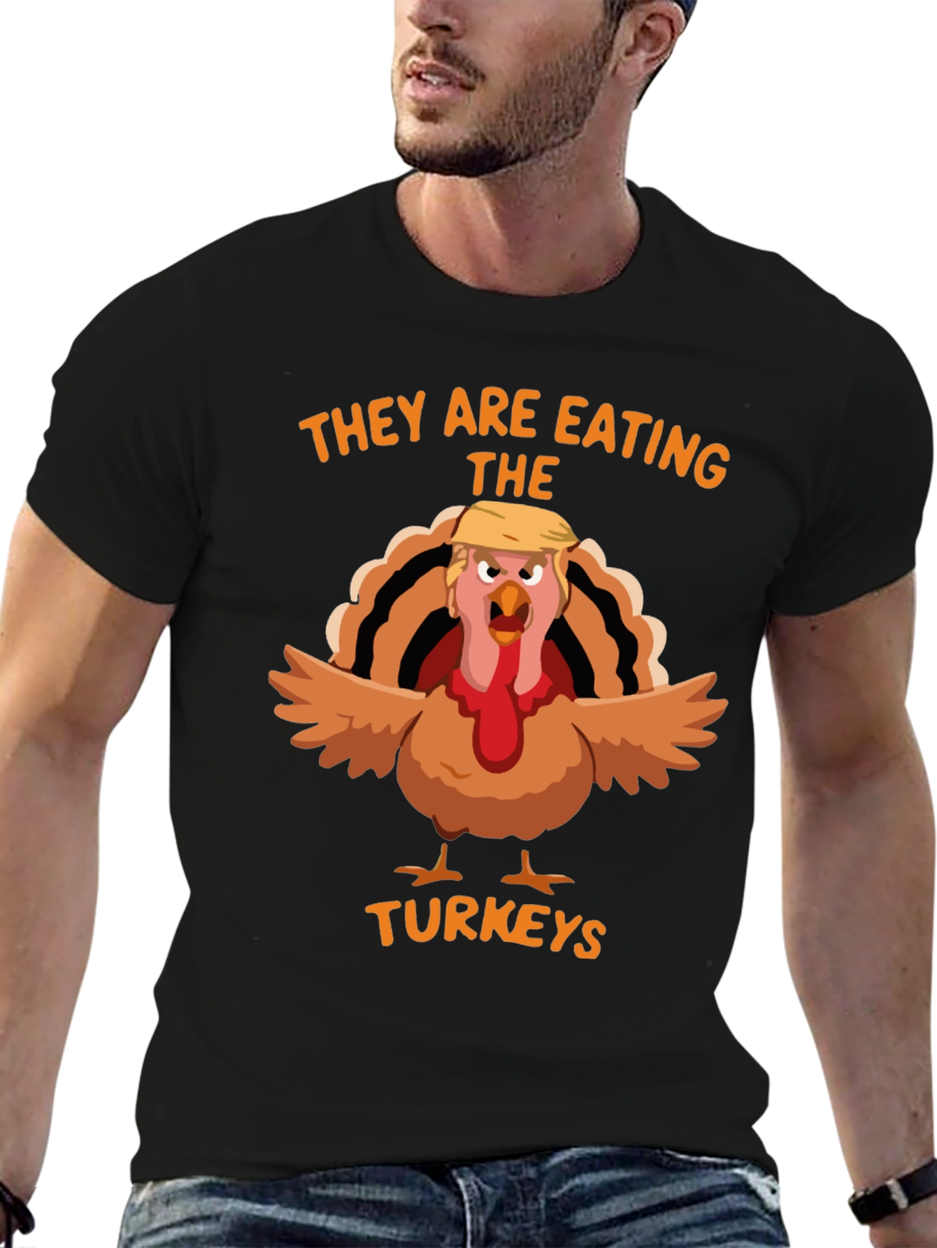 This novelty black T-shirt features a humorous design with a cartoon turkey sporting a Donald Trump hairstyle. The text "THEY ARE EATING THE TURKEYS" is displayed prominently, adding a playful touch. Perfect for Thanksgiving gatherings, political humor enthusiasts, or anyone who enjoys making a statement with their clothing. The shirt appears to be made of a comfortable, soft fabric, ideal for casual wear. Wear it to your next holiday dinner and be prepared for laughs and conversations!