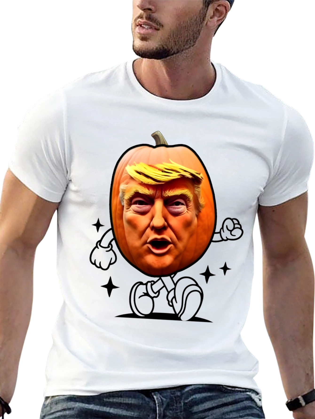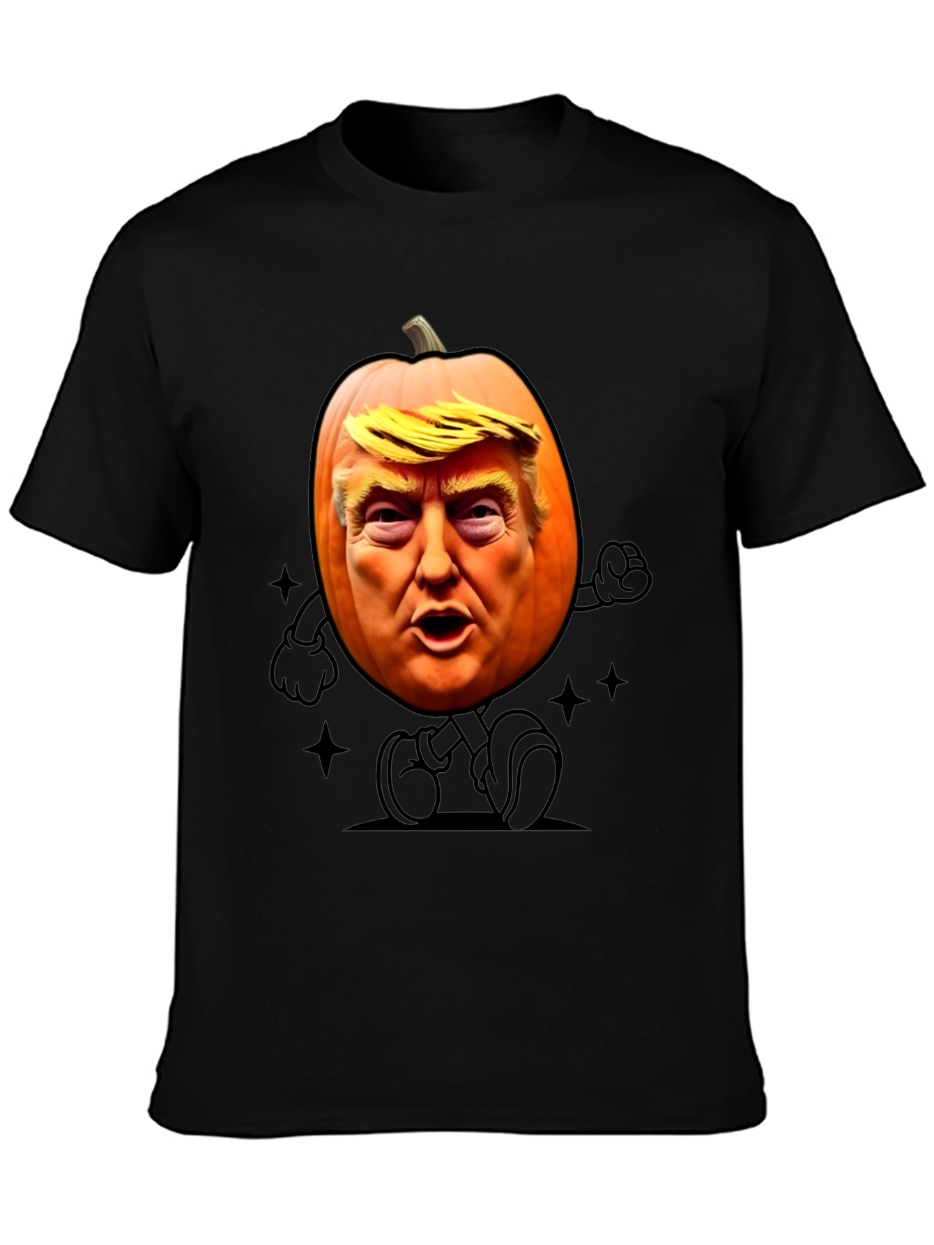 Get ready for Halloween with this unique and funny t-shirt! Featuring a cartoon-style pumpkin with a familiar face, this black tee is sure to be a conversation starter. The bold design is printed on a comfortable, casual fit t-shirt, perfect for parties, trick-or-treating, or just showing off your Halloween spirit. Made with a soft, breathable fabric, it ensures all-day comfort. Stand out from the crowd and let your sense of humor shine with this one-of-a-kind Halloween tee.