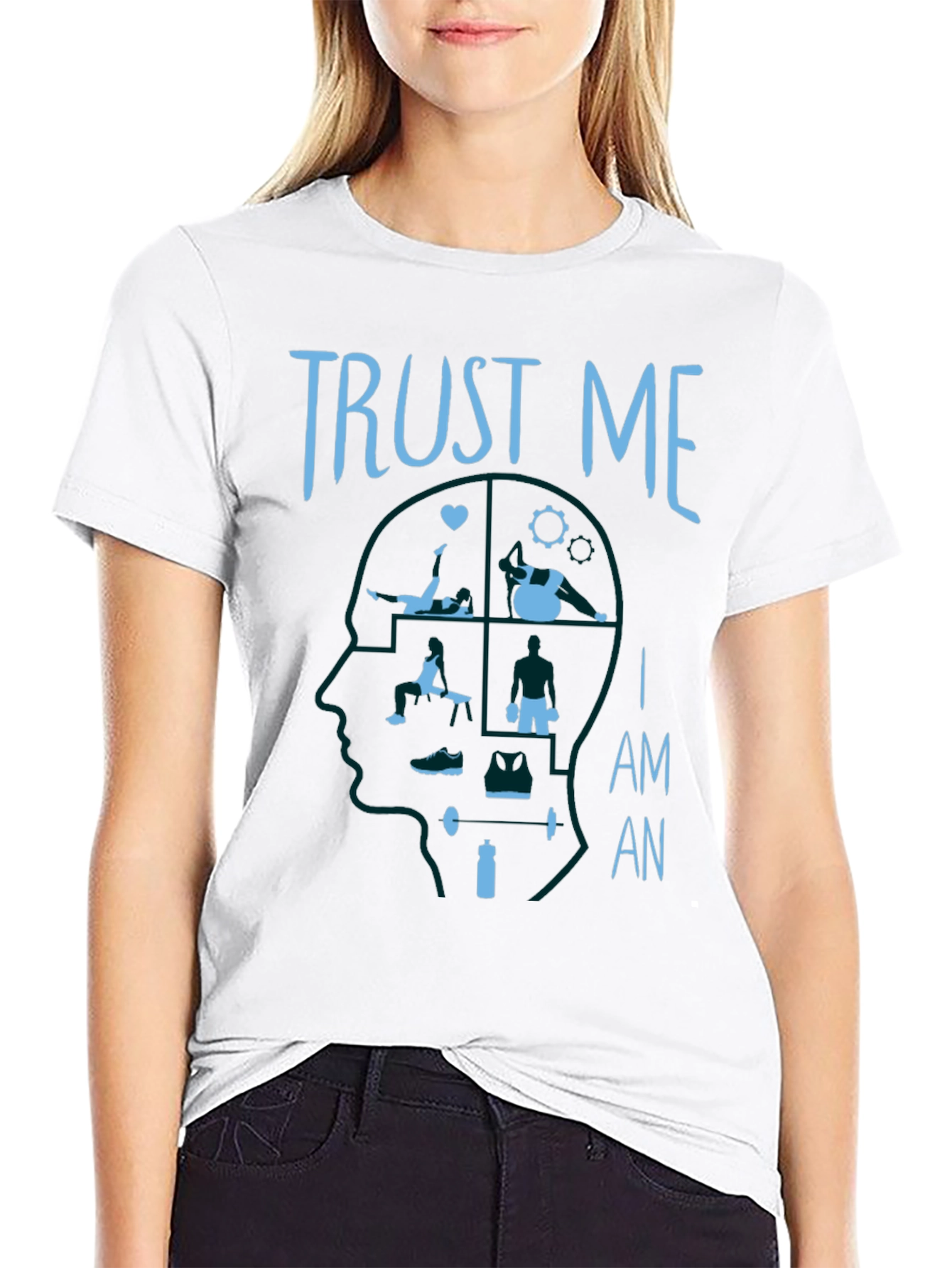 Show off your love for fitness with this unique graphic t-shirt. This black tee features a creative design showing the head filled with gym and exercise icons. Made from what appears to be comfortable cotton material, this short-sleeved shirt offers both style and breathability. The light blue graphic print showcases the phrase "TRUST ME I AM AN" with fitness-related images inside a head outline. Ideal for workouts or casual wear, it's a perfect conversation starter for fitness enthusiasts. Get yours today and let everyone know your dedication to health and wellness.