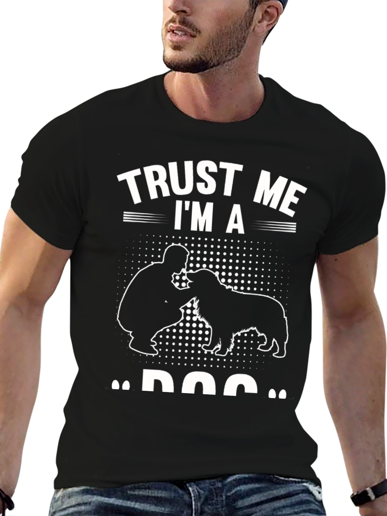 Show your love for dogs with this stylish black t-shirt. Featuring a playful design, this shirt says "Trust Me I'm a Dog" and depicts a person interacting with a dog. The design is in white on a black background for high contrast and readability. The t-shirt appears to be made of a comfortable, breathable material, perfect for casual wear. This shirt would be ideal for dog owners, dog lovers, or anyone who appreciates a fun, lighthearted design. Get yours today and let everyone know you're a friend to canines!