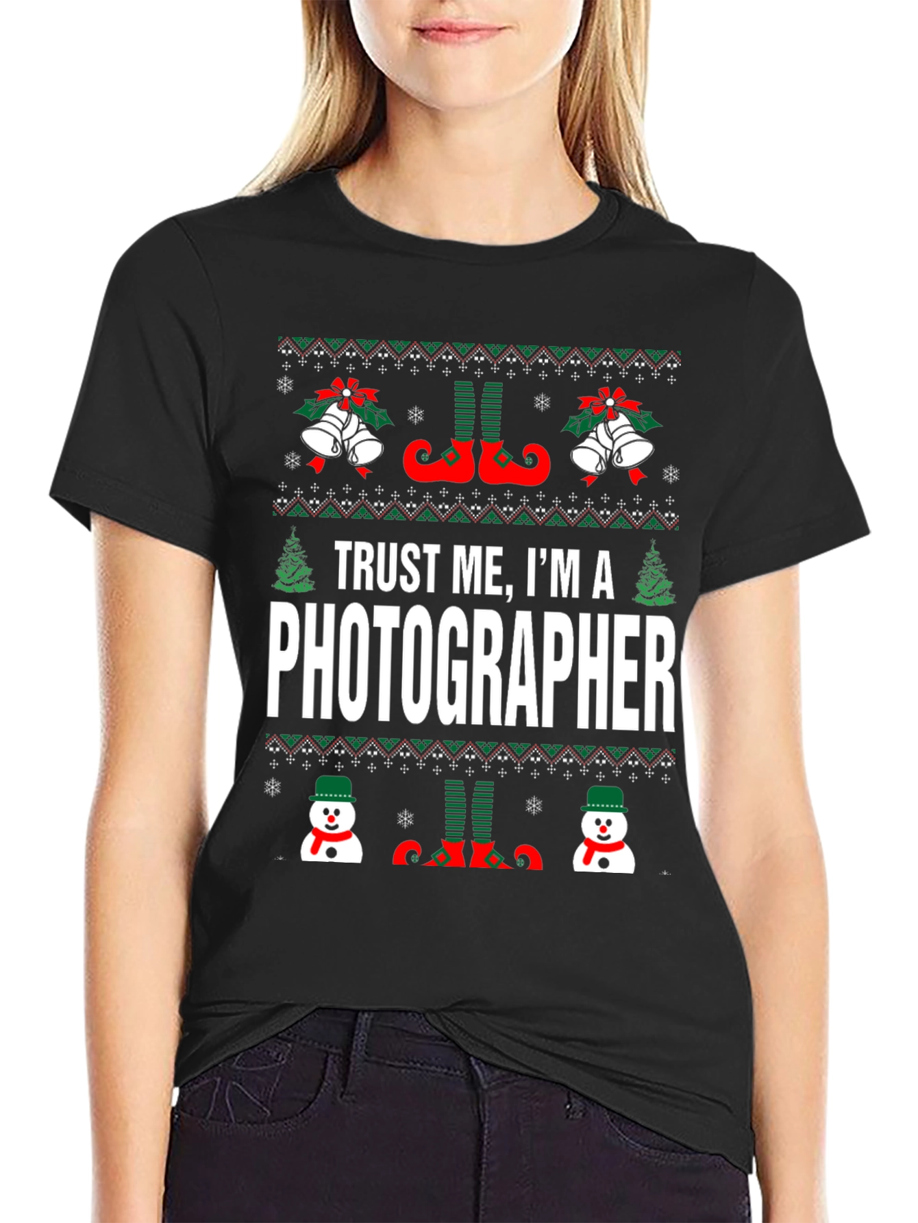 Get ready to capture the holiday spirit with this fun and festive 'Trust Me, I'm a Photographer' ugly Christmas t-shirt. The black tee features a playful design, incorporating Christmas elements like bells, elf shoes, snowmen, and snowflakes, arranged in an 'ugly sweater' style. The bold white text stands out, making it perfect for holiday gatherings, photo shoots, or casual wear during the festive season. It's a unique and humorous way for photographers to show off their profession and Christmas cheer. Made from a comfortable and durable fabric, this t-shirt will keep you cozy all winter long!