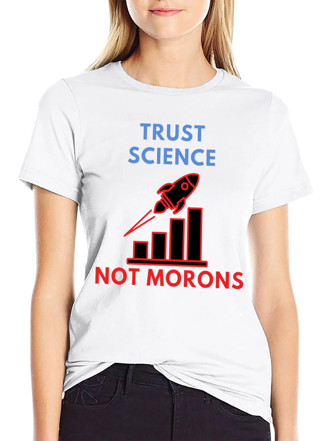 Show your support for reason and knowledge with this eye-catching black t-shirt. Featuring a bold design, the shirt displays 'TRUST SCIENCE' in blue lettering above a red graphic of a rising graph and rocket. 'NOT MORONS' appears in red below. Crafted from a comfortable, breathable fabric, this tee is perfect for everyday wear. Ideal for science enthusiasts, educators, and anyone who values critical thinking. Make a statement and spark conversations with this unique and stylish shirt. Available in various sizes.