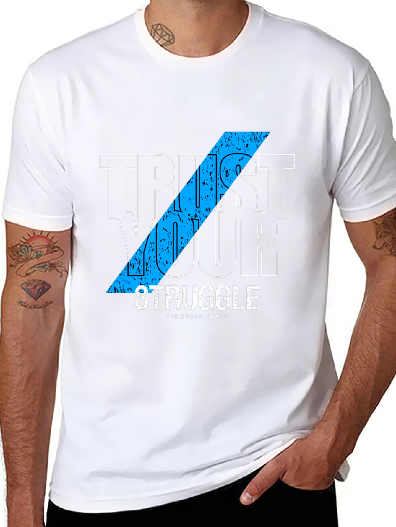 Embrace motivation with this black graphic tee featuring "TRUST YOUR STRUGGLE" emblazoned across the chest. A distressed blue graphic line adds a modern, edgy touch. Crafted from a comfortable cotton blend, this short-sleeved shirt offers a relaxed fit perfect for everyday wear. Ideal for casual outings, gym sessions, or a statement piece. Show off your determination and style. Available in various sizes.