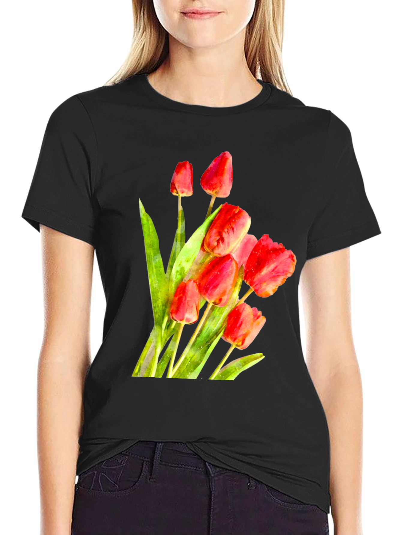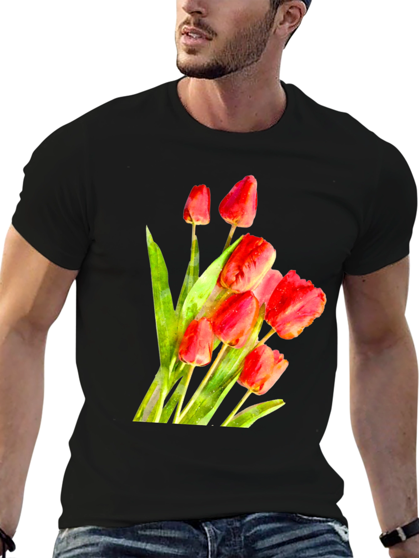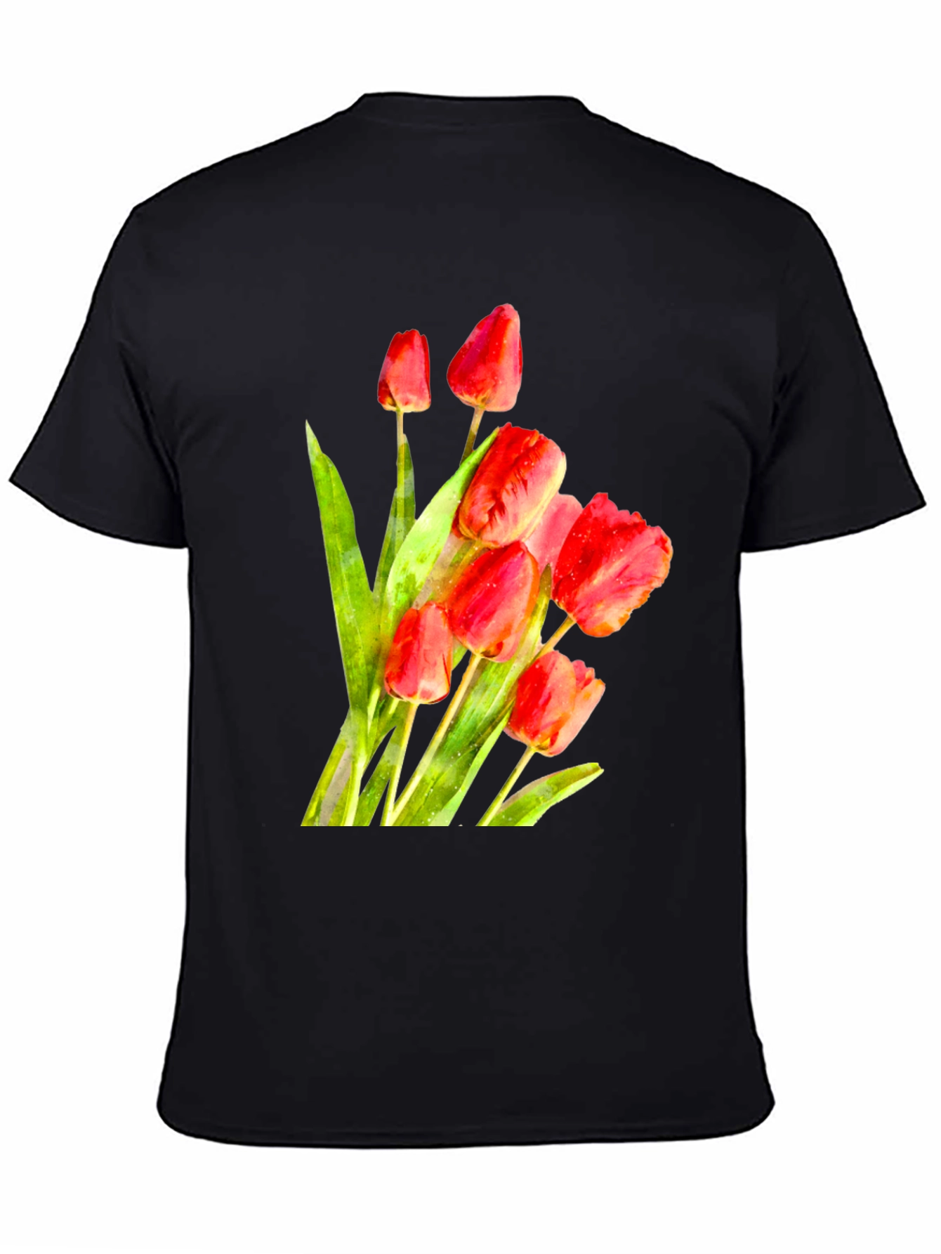 Showcase your love for nature with this eye-catching black graphic tee! The shirt features a vibrant, artistic print of a tulip bouquet in shades of red and green. The watercolor-style design adds a touch of elegance to the casual tee. Perfect for everyday wear, this comfortable shirt is ideal for expressing your unique style. Pair it with jeans or shorts for a relaxed, stylish look. A great addition to any wardrobe for those who appreciate floral designs and comfortable fashion.