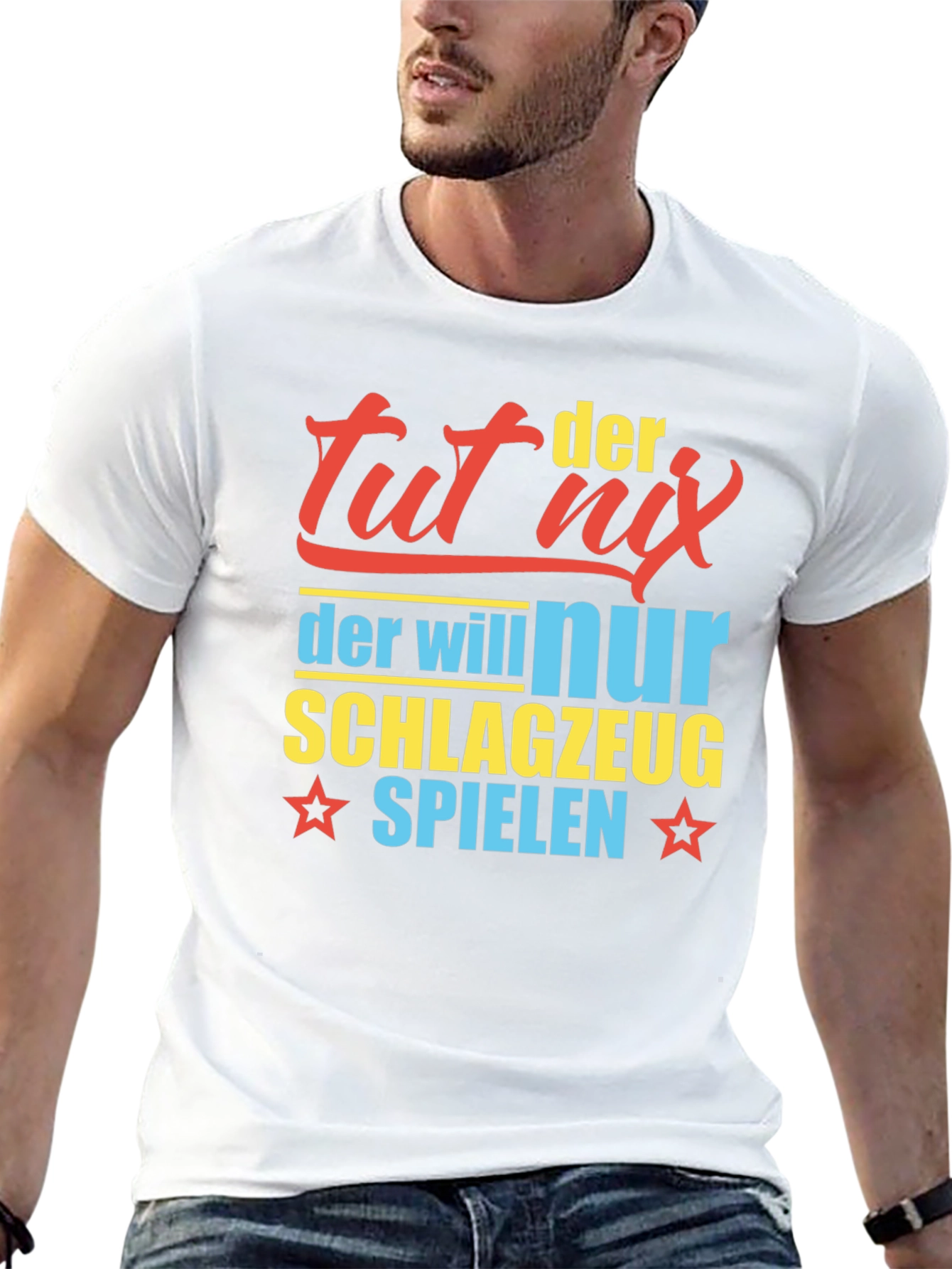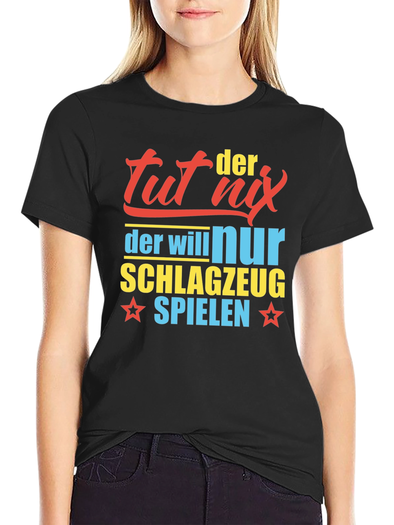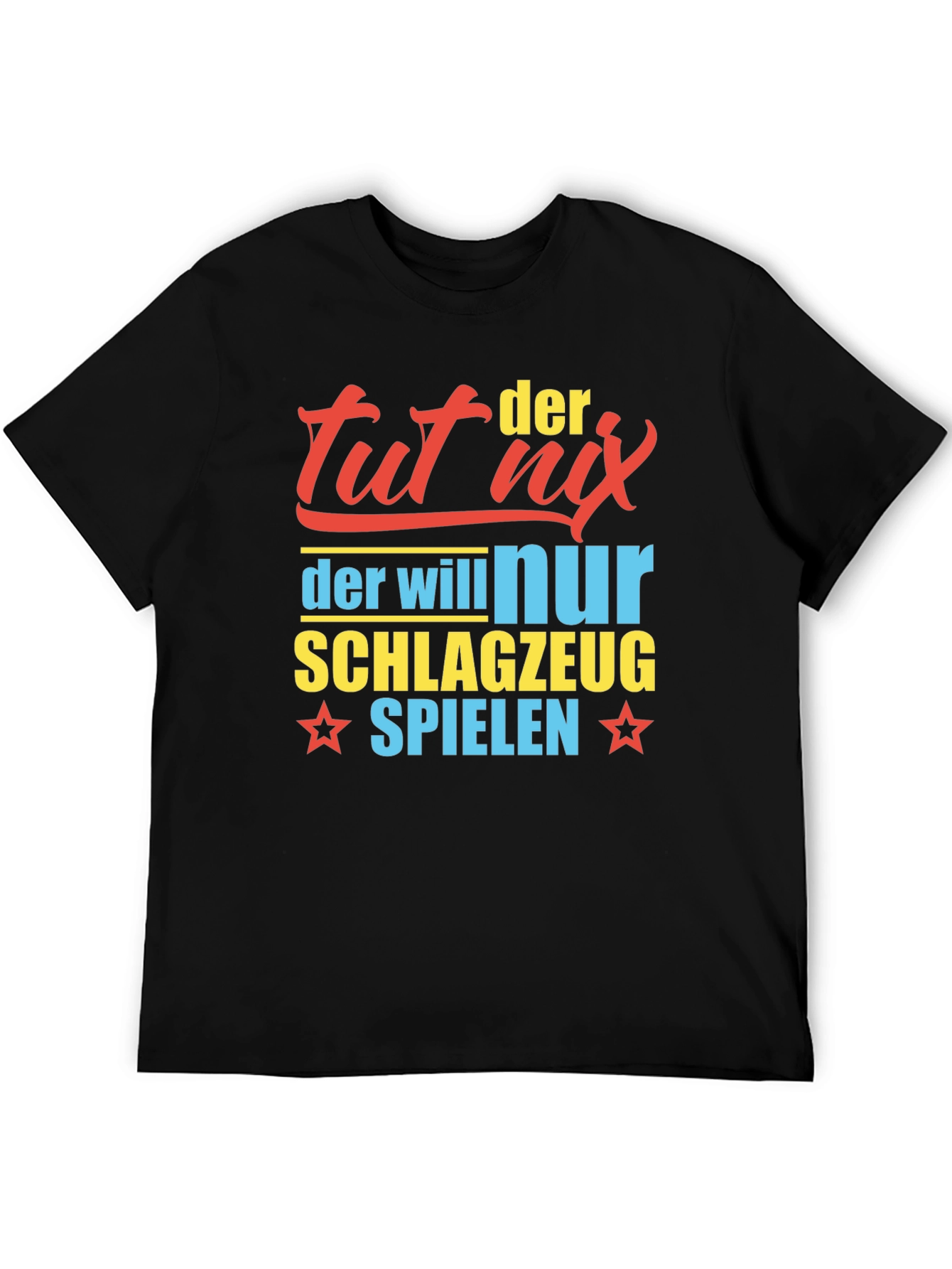 Showcase your passion for drumming with this eye-catching t-shirt. Featuring a bold, colorful design, the shirt displays the playful text "Tut Nix Der Will Nur Schlagzeug Spielen". The text is printed in a mix of red, yellow, and blue. Made from comfortable, breathable fabric, this classic fit tee is perfect for casual wear or band practice. Let everyone know where your interests lie with this playful tee.