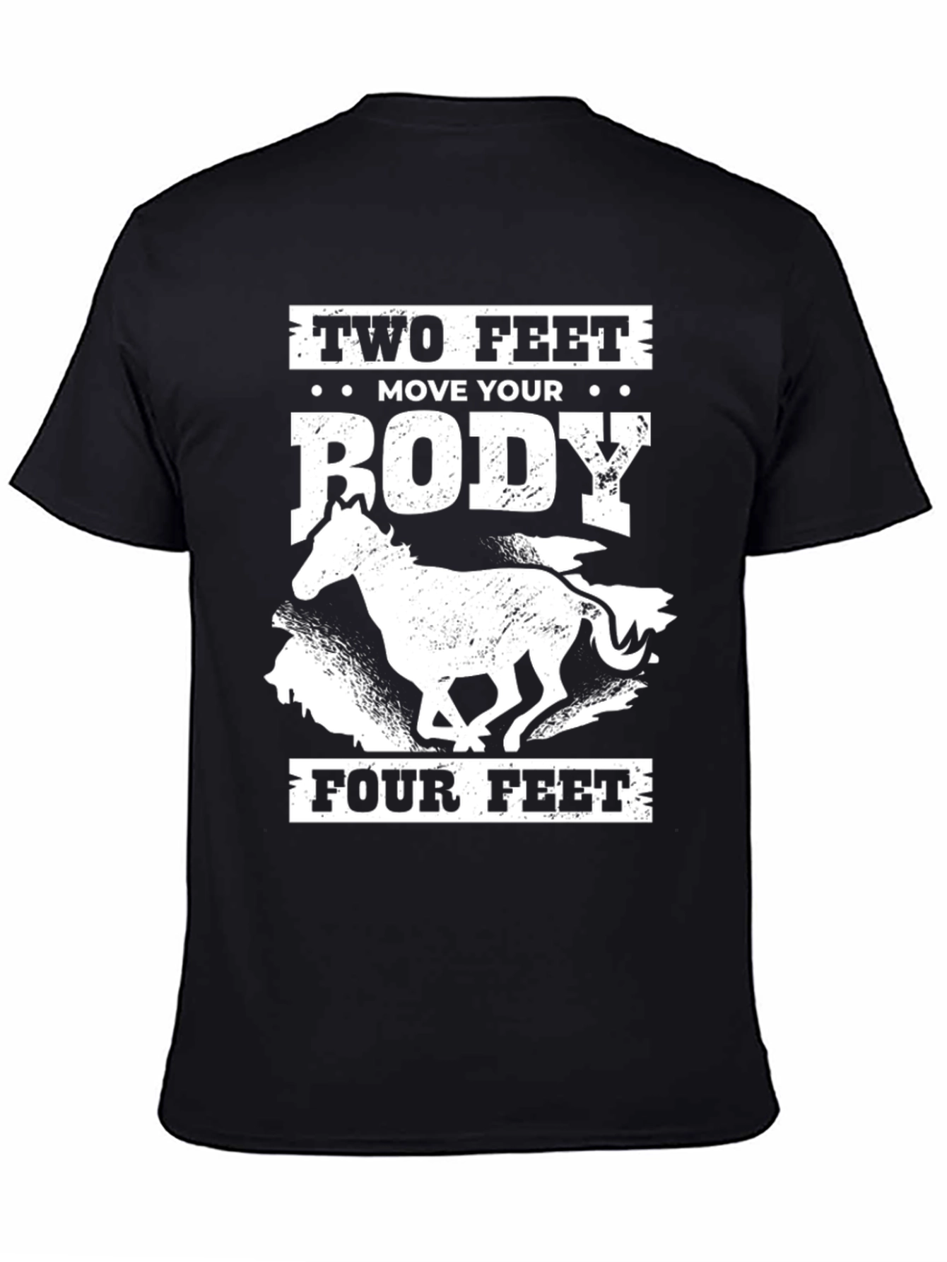 Show your love for horses with this unique graphic tee. This black t-shirt features a bold white print with the phrase "Two Feet Move Your Body Four Feet," centered around a silhouette of a running horse. Made from a comfortable and breathable fabric, this shirt is perfect for everyday wear, casual outings, or horse-riding adventures. Its eye-catching design is sure to spark conversations and showcase your passion for equestrian life. Whether you're at the barn or just out and about, this tee makes a stylish statement. A must-have for horse lovers!