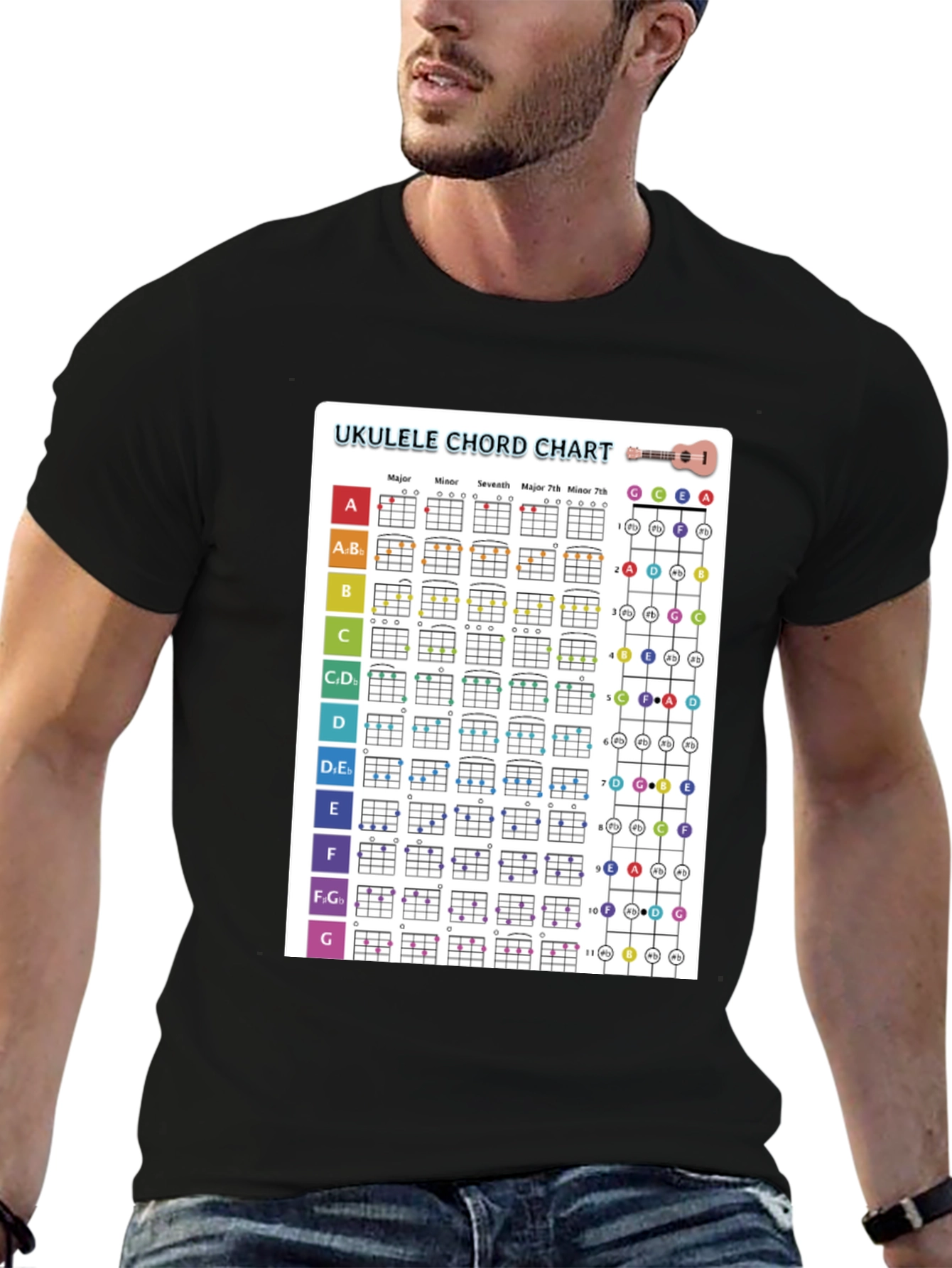 Rock your passion for music with this unique black t-shirt featuring a detailed ukulele chord chart! The vibrant chart includes essential chords for ukulele players, from A to G, displayed in an easy-to-read format. It's perfect for practicing on the go or showing off your musical interest. Made from comfortable fabric, this tee is ideal for casual wear, music lessons, band practice, or a thoughtful gift for musicians and ukulele enthusiasts. Stand out and let the music speak for you with this eye-catching conversation starter!