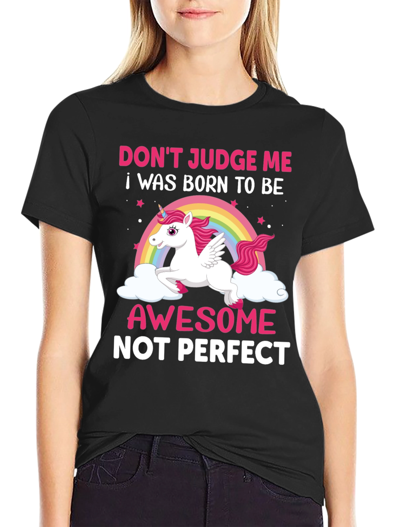 Show your unique spirit with this fun black t-shirt. Featuring a vibrant cartoon graphic of a unicorn with pink hair, wings, and horn set against a rainbow and cloud backdrop, this tee proudly proclaims "Don't judge me, I was born to be AWESOME, NOT PERFECT". Comfortable and eye-catching, this casual shirt is perfect for expressing individuality. It's ideal for casual outings, parties, or just making a statement. The design appeals to unicorn lovers and those who embrace their authentic selves. This shirt is a great conversation starter and a fun addition to any wardrobe.