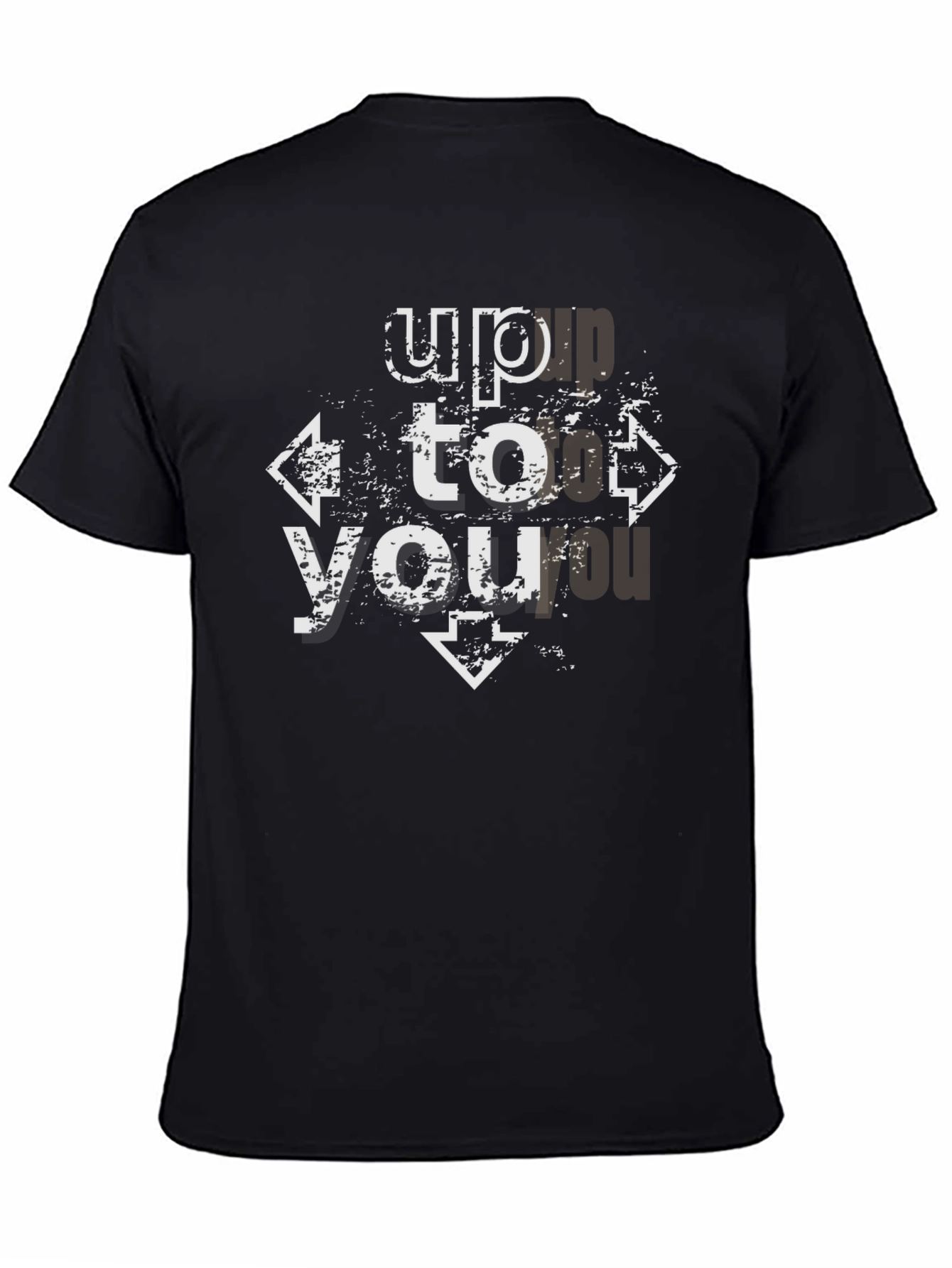 This sleek black t-shirt features a bold, distressed graphic design with the phrase "Up to You" displayed prominently. The design incorporates directional arrows, adding a unique and modern touch. Made from a soft, breathable fabric, this tee offers both comfort and style. Ideal for casual wear, it pairs perfectly with jeans, shorts, or your favorite everyday attire. Show off your individual style with this eye-catching tee. Perfect for anyone who enjoys a versatile and trendy addition to their wardrobe. Stand out from the crowd and make a statement with this must-have graphic tee.