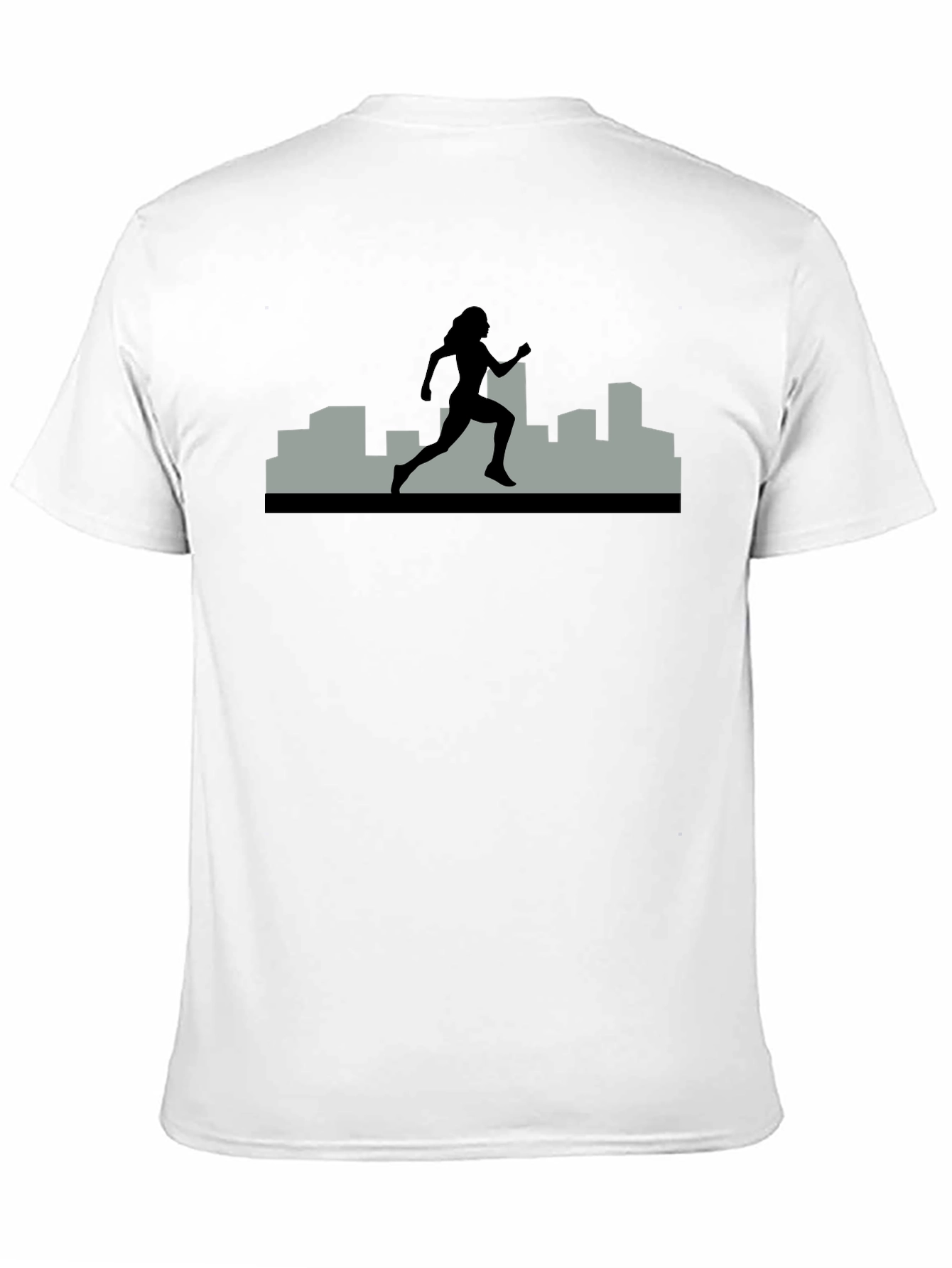 This black t-shirt features a striking silhouette of a runner against an urban cityscape. The design is bold and modern, making it a great statement piece for casual wear. Made from what appears to be soft, comfortable cotton, this tee offers both style and comfort. The short sleeves and classic crew neck make it a versatile addition to any wardrobe. Ideal for everyday wear, workouts, or casual outings, this tee shows off your active side. The graphic print is eye-catching and unique. Whether you're hitting the gym or running errands, this shirt combines comfort and style seamlessly.