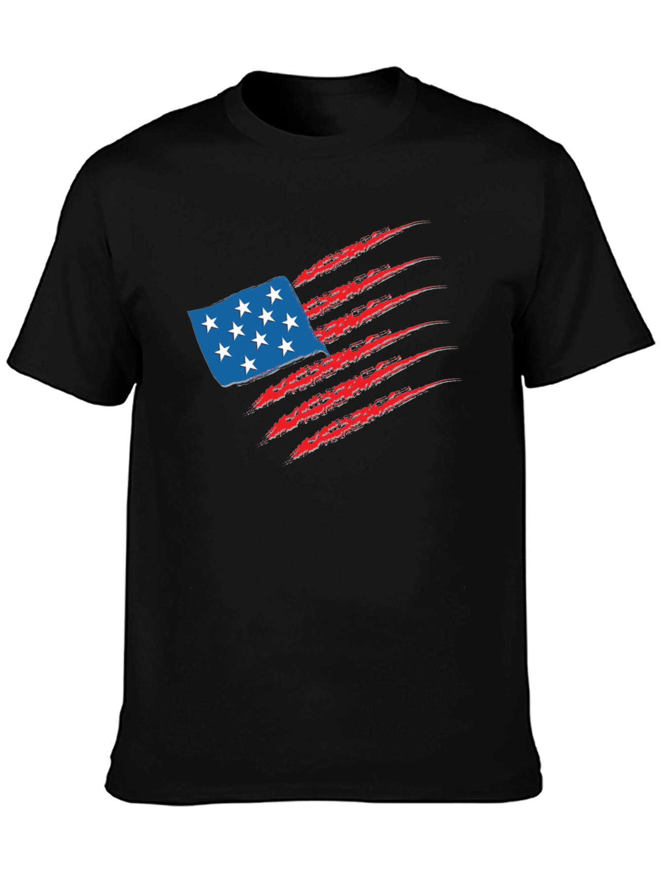 Show your American pride with this striking black graphic tee. Featuring a unique claw mark design revealing a stylized USA flag, this shirt is perfect for casual wear and patriotic events. The design showcases a weathered American flag graphic with vibrant blue and red elements set against a solid black background. Made from comfortable materials, this tee offers a great fit and feel. Ideal for expressing your love for the USA. Whether you're celebrating Independence Day or just want to showcase your patriotism, this shirt is sure to make a statement.