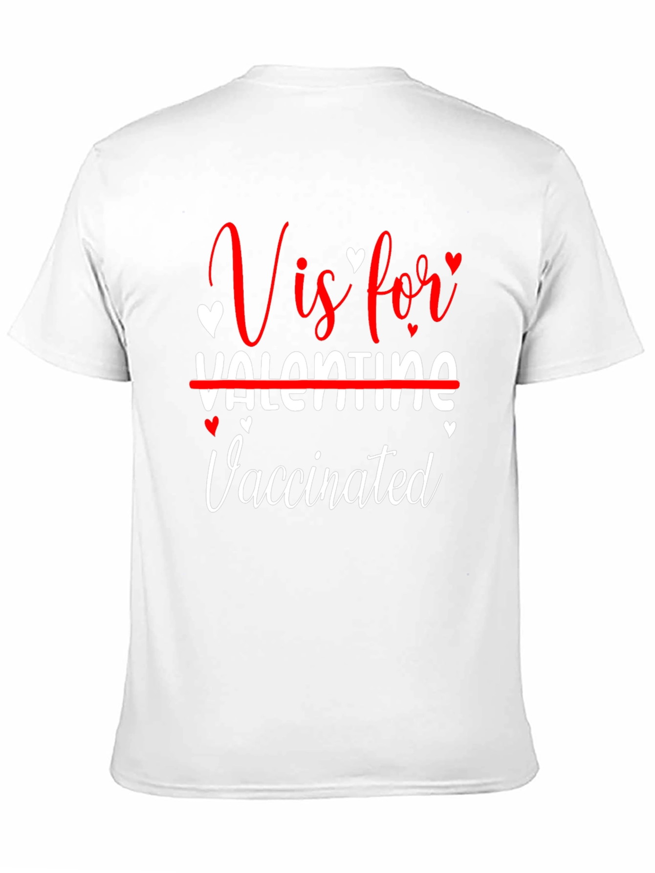 Show off your humor and healthy lifestyle with this "V is for Vaccinated" t-shirt. This black t-shirt features a witty graphic design with the phrase "V is for" in a stylish red font, followed by "Valentine" crossed out and "Vaccinated" in white script. Small heart accents add a touch of Valentine's Day spirit. Made from comfortable material, this shirt is perfect for casual wear, Valentine's Day parties, or making a statement wherever you go. A unique and playful way to celebrate self-care and humor.