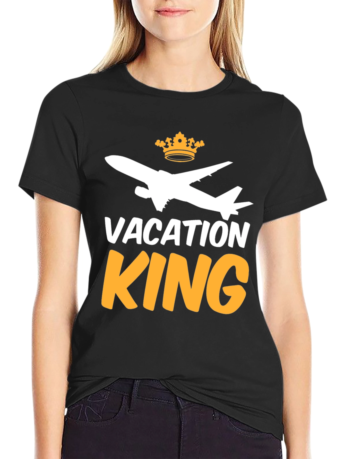Get ready to reign over your next vacation with this bold and stylish black t-shirt! Featuring a crisp white airplane graphic topped with a golden crown, this tee makes a statement. The words "VACATION" and "KING" are emblazoned in contrasting white and golden yellow, ensuring you'll stand out. Made from what appears to be soft, breathable fabric, this shirt is perfect for travel days, sightseeing, or lounging by the pool. Show off your travel royalty status and let everyone know who's in charge of relaxation!
