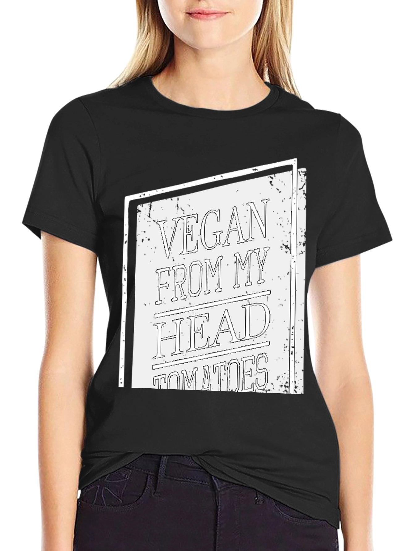This bold black t-shirt features a unique design that proclaims "Vegan From My Head Tomatoes" in a distressed, outlined font. The design is encased in a rectangular border, giving it a framed appearance. Made from what looks to be a soft and comfortable material, this tee is perfect for showcasing your plant-based lifestyle with a touch of humor. Ideal for casual wear, vegan events, or as a conversation starter. Show off your love for veggies and conscious living with this statement tee!