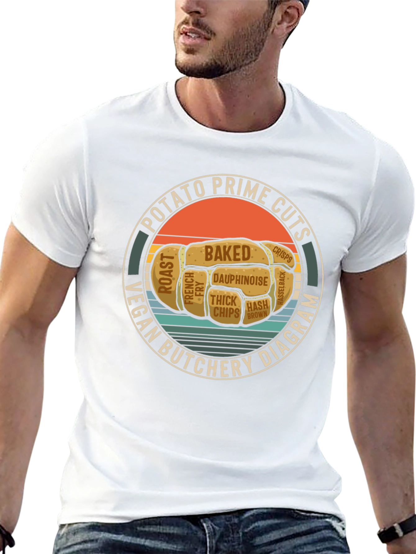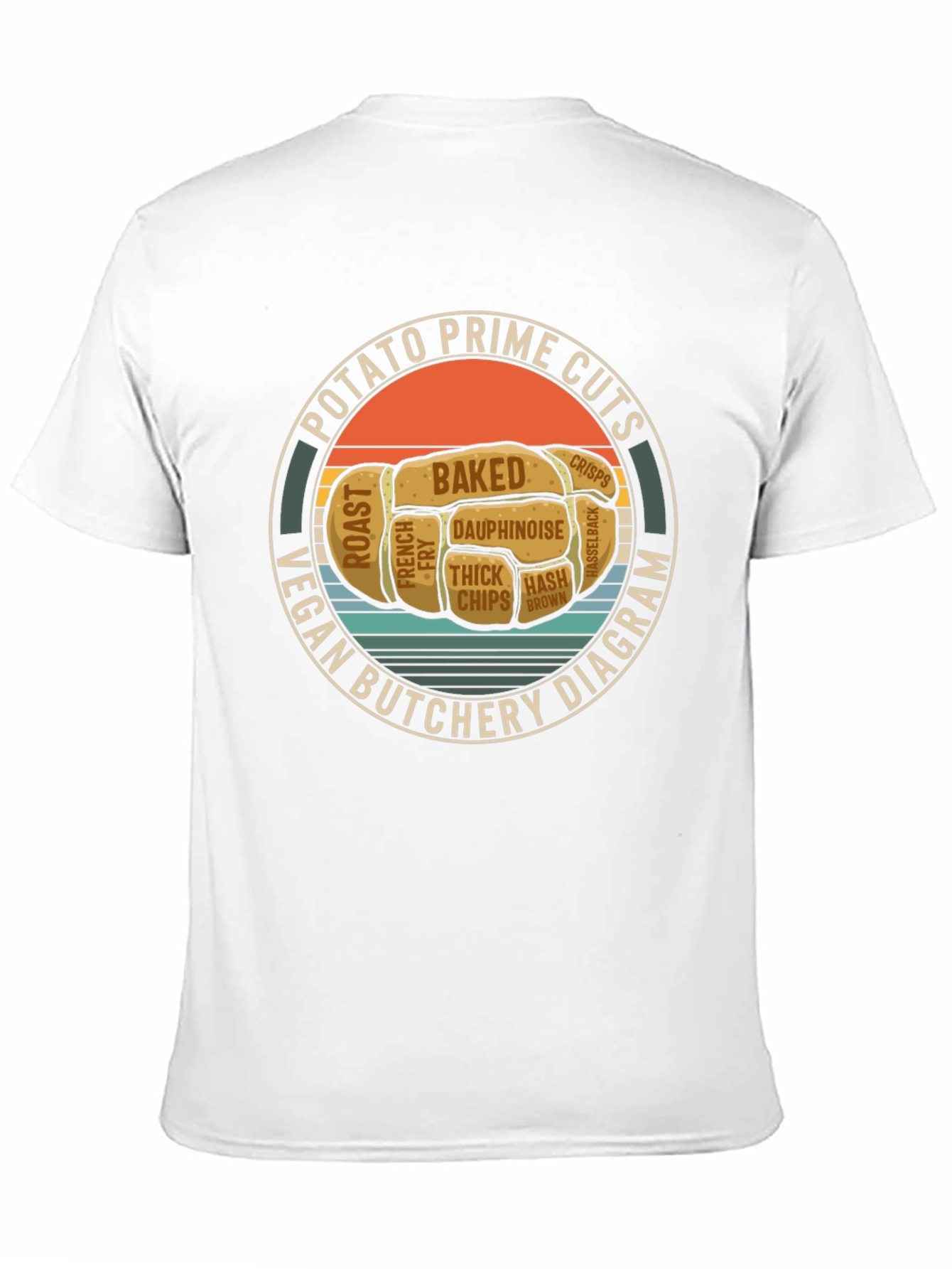 This black t-shirt features a unique and humorous graphic showcasing a 'Vegan Potato Prime Cuts Butchery Diagram'. The design is printed within a circular badge with text surrounding a potato-shaped image that is divided into sections labeled with different potato preparations like 'Baked', 'Roast', 'French Fry', 'Crisps', and 'Hash Brown'. This t-shirt is perfect for vegans, vegetarians, potato lovers, or anyone with a sense of humor. Made from comfortable fabric, it's suitable for casual wear. Showcase your love for potatoes and a plant-based lifestyle with this eye-catching and conversation-starting tee!