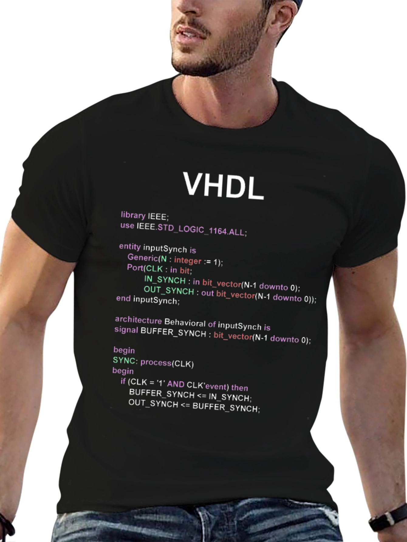 Show off your passion for hardware design with this unique VHDL code t-shirt. The shirt features a vibrant, eye-catching print of actual VHDL code, making it a perfect conversation starter for engineers, programmers, and tech enthusiasts. Made from a comfortable, breathable fabric, this t-shirt is ideal for everyday wear, coding sessions, or tech meetups. The detailed code snippet adds a touch of sophistication and intellectual flair to your wardrobe. Whether you're debugging a critical function or simply expressing your love for digital logic, this shirt is a must-have for any VHDL aficionado. Grab yours today and let your programming pride shine!