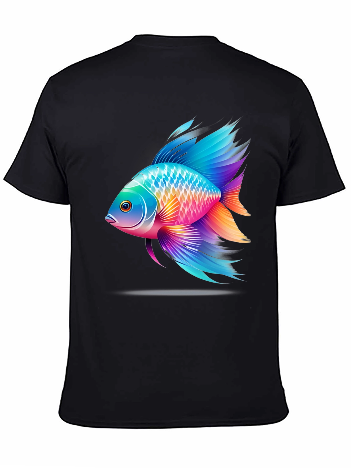 Make a splash with this unique black t-shirt featuring a vibrant and artistic fish graphic. The eye-catching design showcases a colorful fish with intricately detailed fins and scales, blending hues of blue, pink, orange, and yellow. Made from a soft and breathable cotton blend, this tee offers both style and comfort. Ideal for casual wear, it's perfect for expressing your personality and love for aquatic life. Whether you're heading to the beach, a casual outing, or simply want to add a pop of color to your wardrobe, this fish graphic t-shirt is a standout choice.
