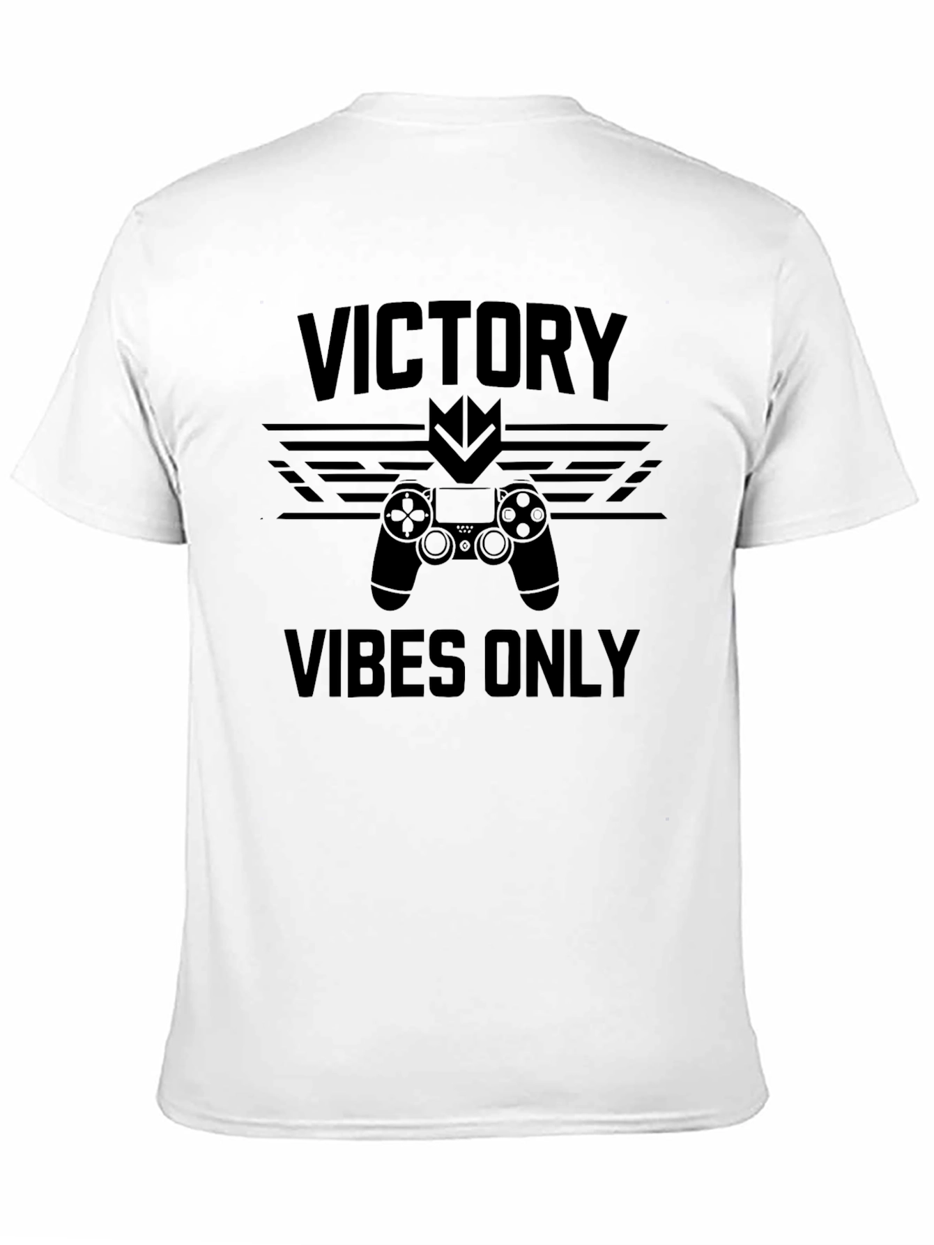Elevate your gaming style with this sleek black t-shirt featuring a bold 'Victory Vibes Only' design. A controller graphic with stylized wings adds a unique gamer touch. Made from a soft, comfortable fabric, this shirt is perfect for long gaming sessions or casual wear. Show off your passion for gaming in style and comfort. Ideal for gamers who want to express their love for video games. Pair with jeans or shorts for a relaxed and confident look. Get ready to level up your wardrobe!