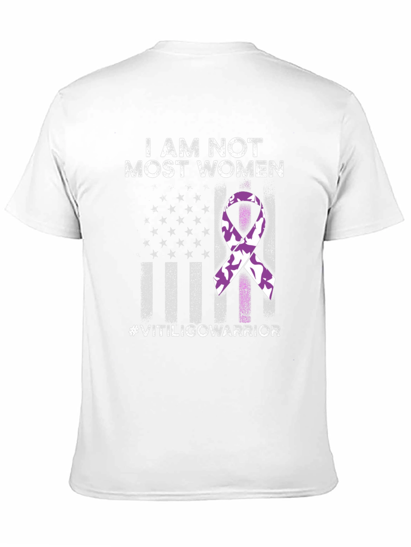 Show your support with this 'I Am Not Most Women' Vitiligo Warrior T-Shirt. This black tee features a unique distressed American flag design, overlaid with a symbolic purple and white awareness ribbon. The hashtag '#VITILIGOWARRIOR' boldly proclaims support. Made from comfortable, breathable fabric, this shirt is perfect for raising awareness, support or everyday wear. Ideal for vitiligo awareness events, support group meetings, or as a thoughtful gift. Make a statement and spread awareness with this empowering t-shirt.