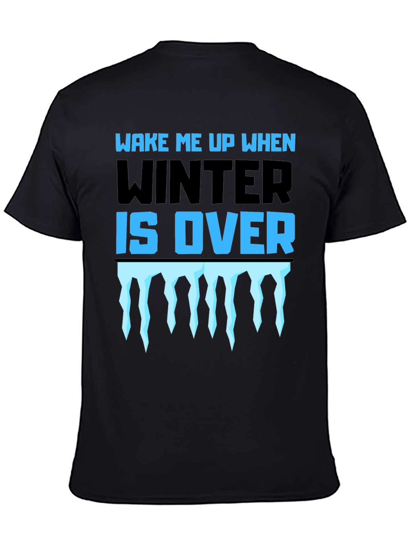 This black t-shirt features a bold and humorous graphic design, perfect for winter enthusiasts who can't wait for warmer days. The print includes the phrase "Wake Me Up When Winter Is Over" in a combination of black and light blue lettering. Beneath the text, a series of light blue icicles creates a visually appealing border. Crafted from a comfortable and durable fabric, this tee is ideal for casual wear, lounging at home, or layering under a jacket. Show off your sense of humor and countdown the days until spring with this unique and stylish t-shirt.