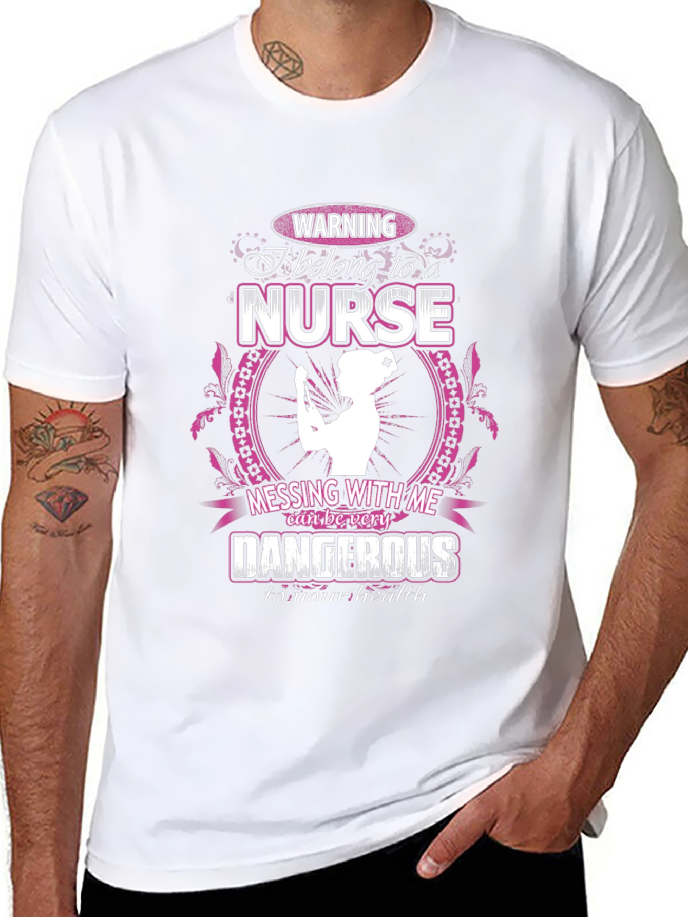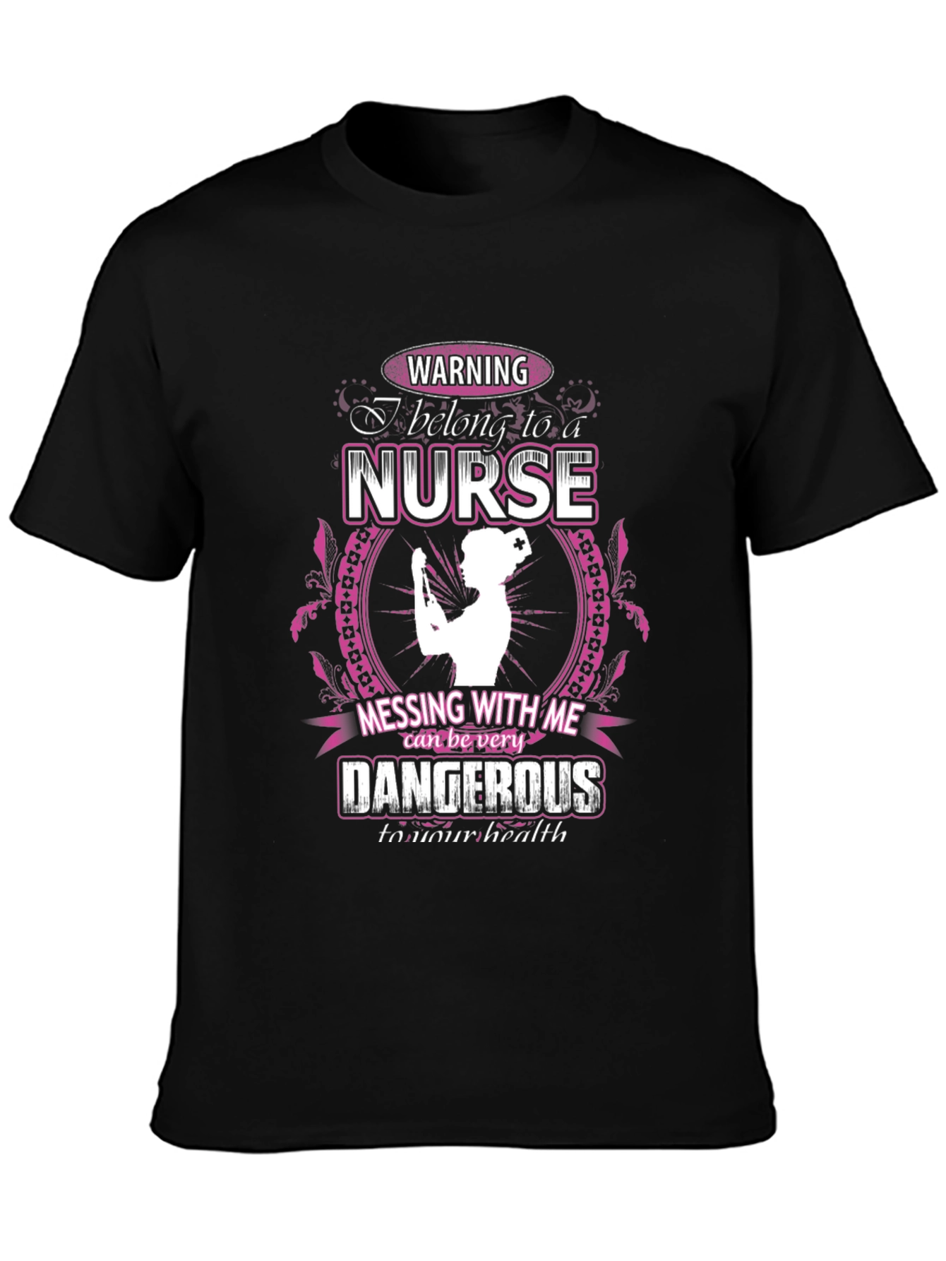Show your pride with this bold black t-shirt featuring a unique "Warning I belong to a Nurse" graphic. The design incorporates decorative pink accents, an illustrative nurse silhouette, and the assertive phrase "Messing with me can be very Dangerous to your health." Crafted from a comfortable-looking fabric, this tee is ideal for casual wear, nurse appreciation events, or as a lighthearted gift. Make a statement while staying comfortable. Grab yours today and let everyone know you're connected to a force to be reckoned with!
