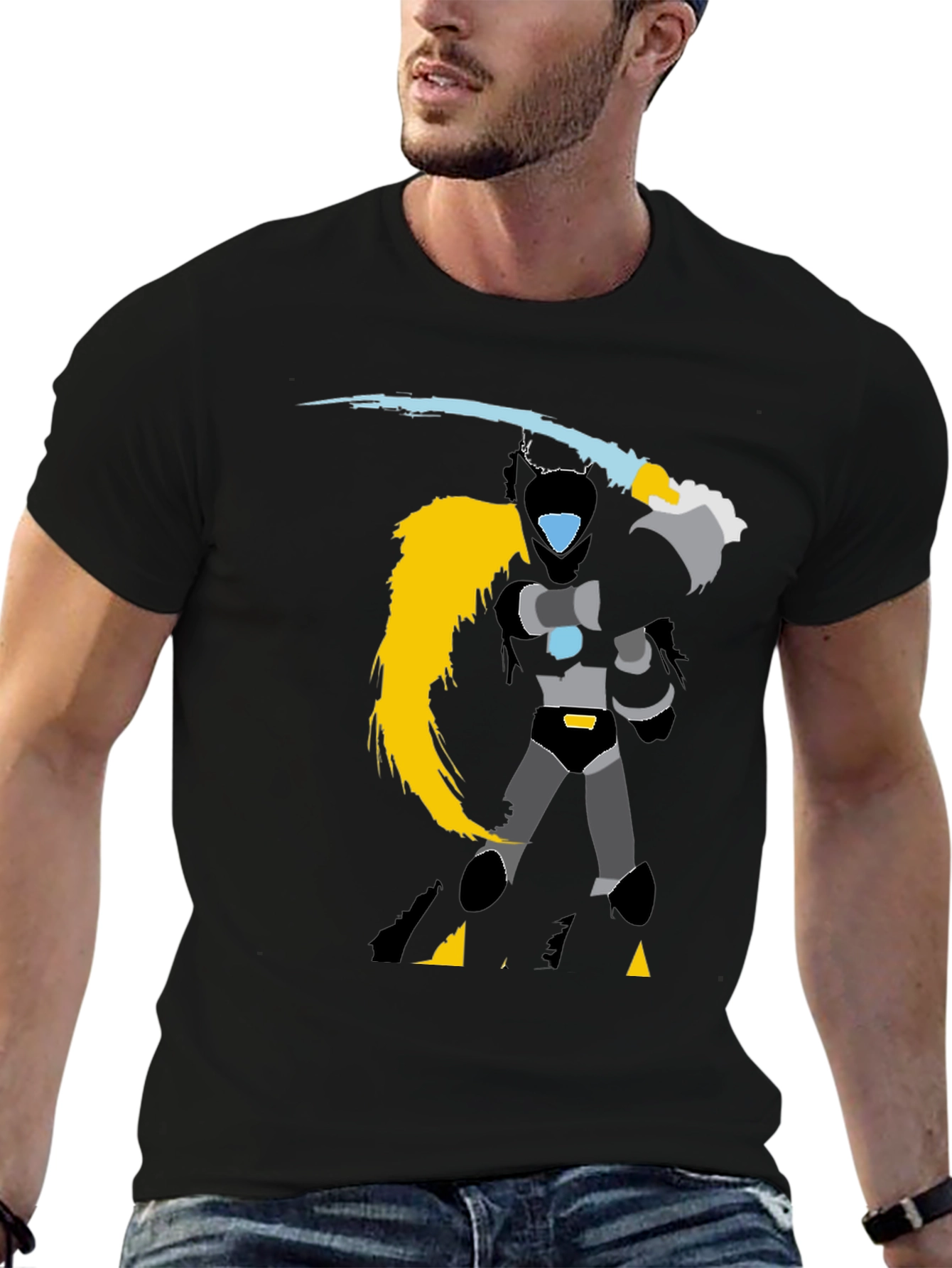 Unleash your inner hero with this bold black graphic tee. Featuring a striking warrior design in shades of black, gray, and vibrant yellow, this shirt is sure to turn heads. The dynamic illustration showcases a figure with a sword. Made from a soft, comfortable fabric, this tee is perfect for everyday wear. Whether you're hitting the gym, hanging out with friends, or just relaxing at home, this shirt is a stylish choice. Show off your unique style and make a statement with this eye-catching graphic tee. Get yours today and step into the spotlight!