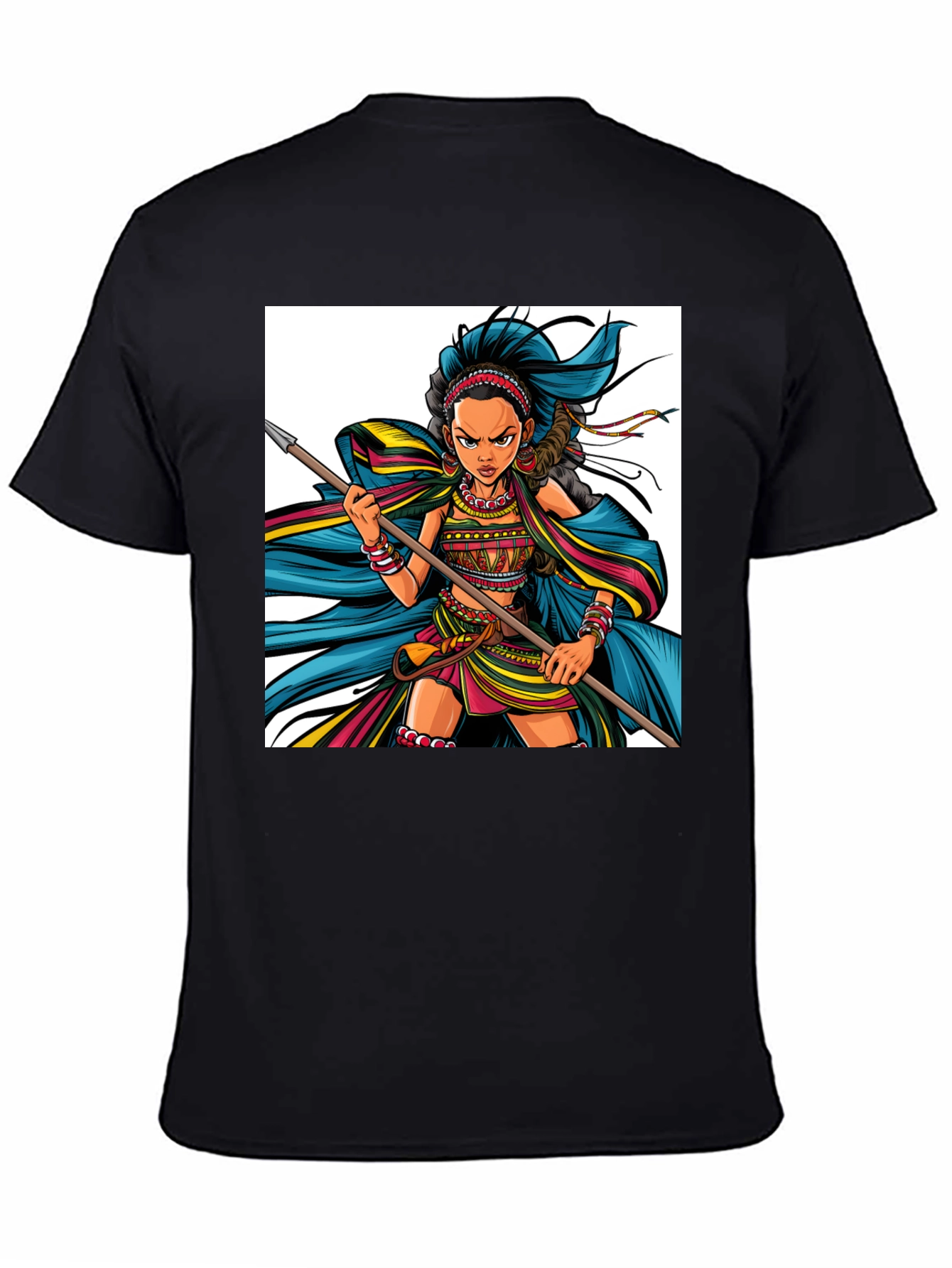 Showcase your bold style with this striking unisex t-shirt. Featuring a vibrant, detailed graphic of a warrior woman with traditional-inspired attire, this tee is sure to turn heads. The design boasts rich colors and intricate details, printed on a soft, comfortable cotton fabric. Perfect for casual wear, concerts, or expressing your unique personality. This eye-catching t-shirt is a must-have addition to any wardrobe. It's comfortable enough for everyday wear and makes a statement wherever you go.