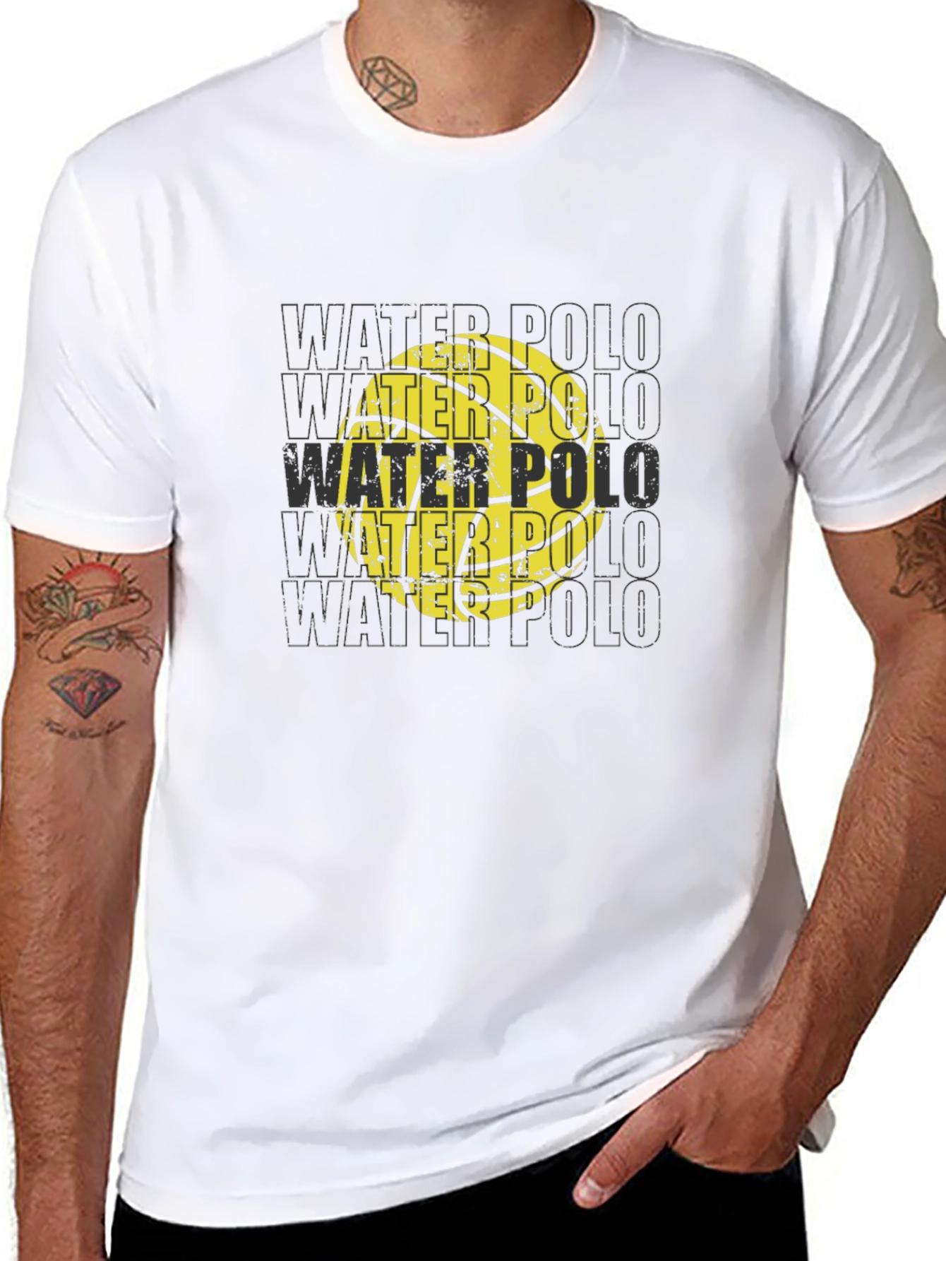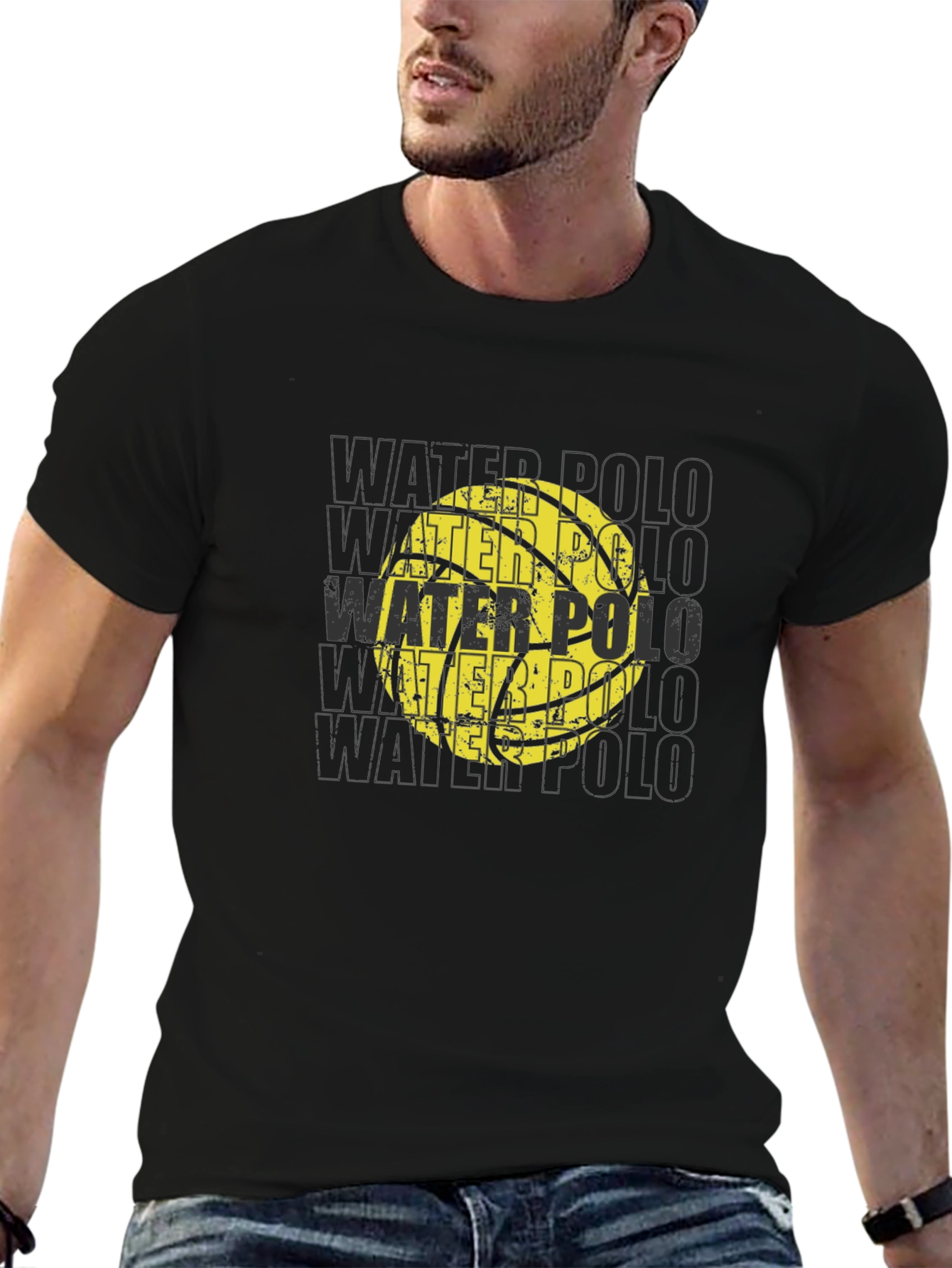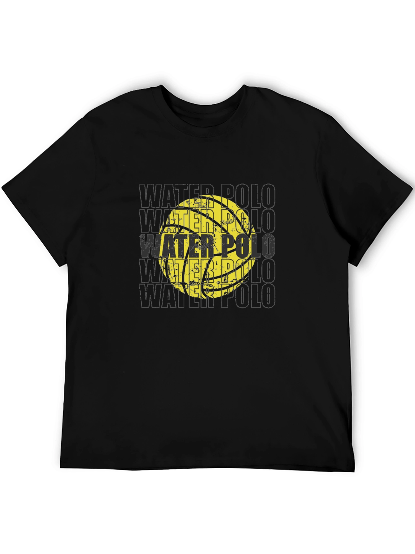 Show off your love for water polo with this eye-catching black t-shirt. The shirt features a distressed-style graphic of a water polo ball with the words "WATER POLO" repeated in the background, creating a dynamic visual effect. Made from a comfortable-looking fabric, this tee appears soft and breathable for all-day wear. Ideal for players, fans, or anyone who enjoys the sport, this t-shirt can be worn casually or as a statement piece at water polo events. The classic black color ensures easy matching with your favorite jeans, shorts, or athletic wear. Make a splash with your style!