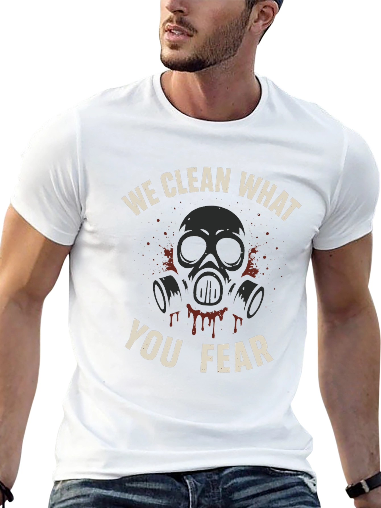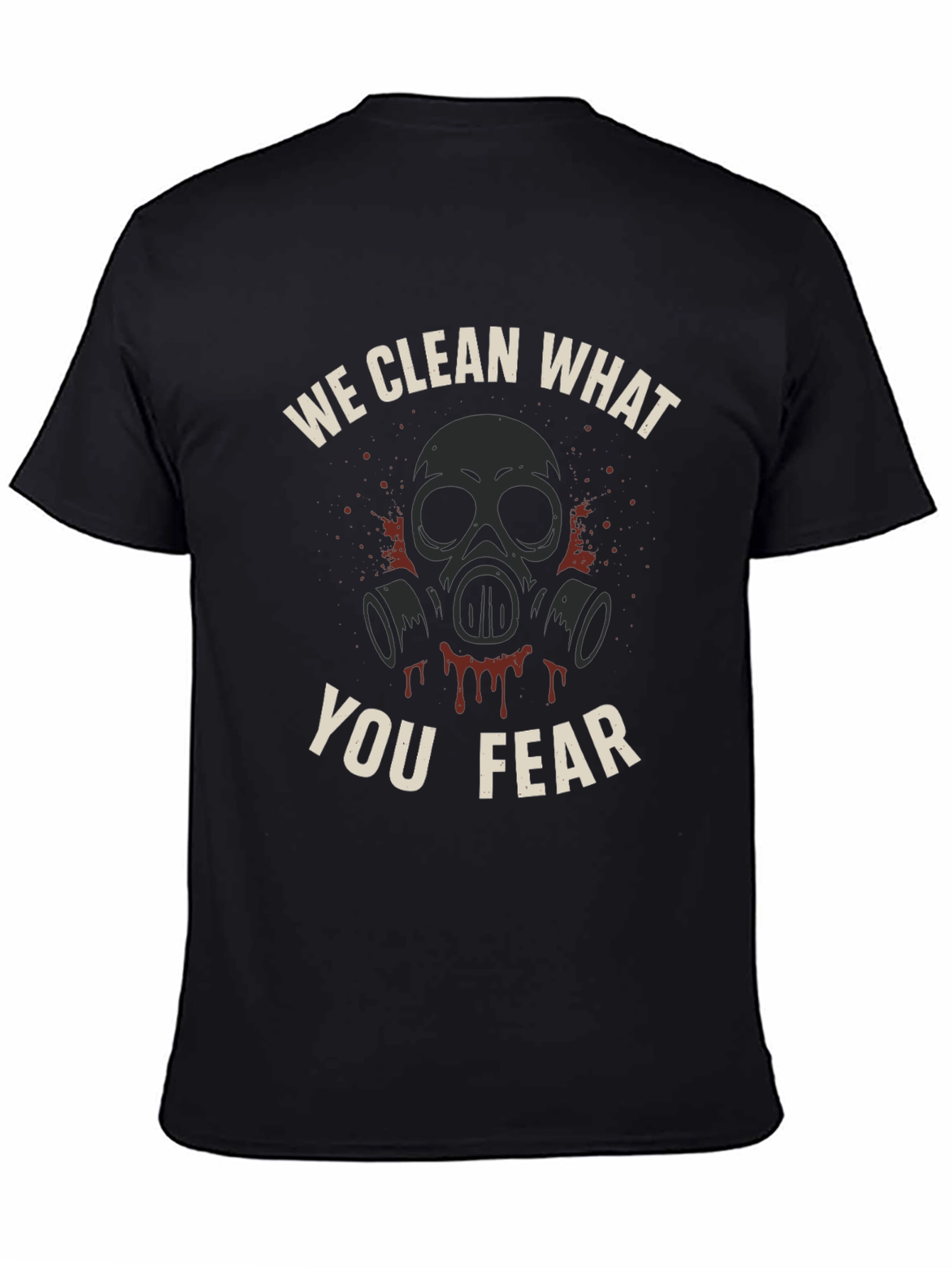 Embrace the bold with this unique graphic tee. Featuring a striking design of a gas mask, splattered with drips, and the powerful statement "We Clean What You Fear," this shirt is sure to turn heads. The design is printed on a classic black tee, perfect for casual wear or making a statement. Made from a comfortable fabric, this t-shirt offers both style and comfort. Ideal for everyday wear, expressing individuality, or as a gift for someone with a unique sense of humor.