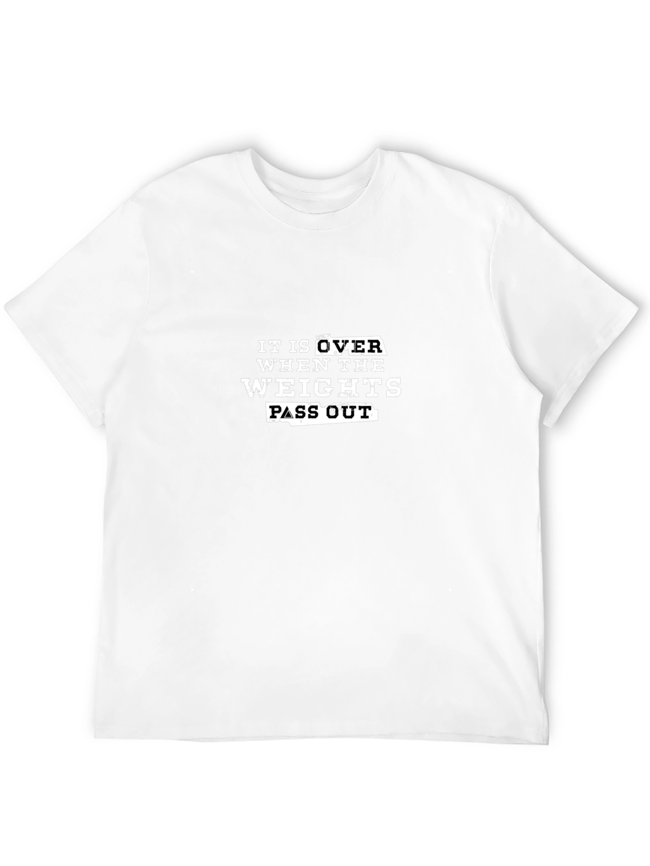 Show off your dedication to fitness with this bold black tee. It features the phrase "It is over when the weights pass out" in a distressed white font. Crafted from soft, breathable fabric, this tee provides ultimate comfort whether you're hitting the gym or relaxing on rest day. The classic fit and short sleeves make it a versatile addition to any casual wardrobe. Wear it to your next workout session or pair it with jeans for a sporty look. This statement piece is sure to turn heads and spark conversations about your fitness passion.