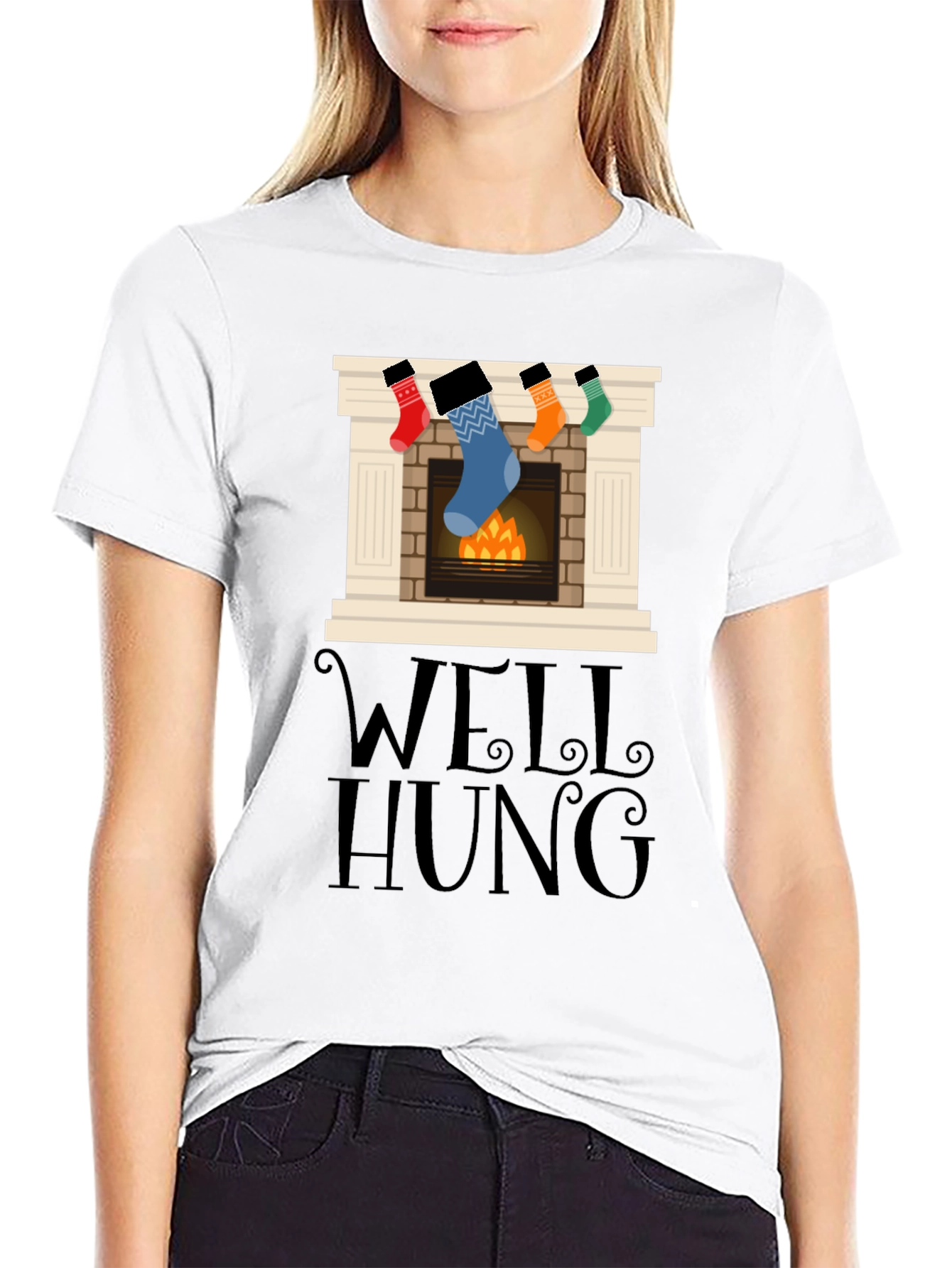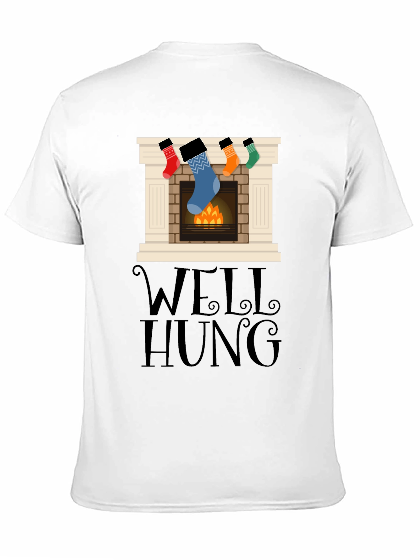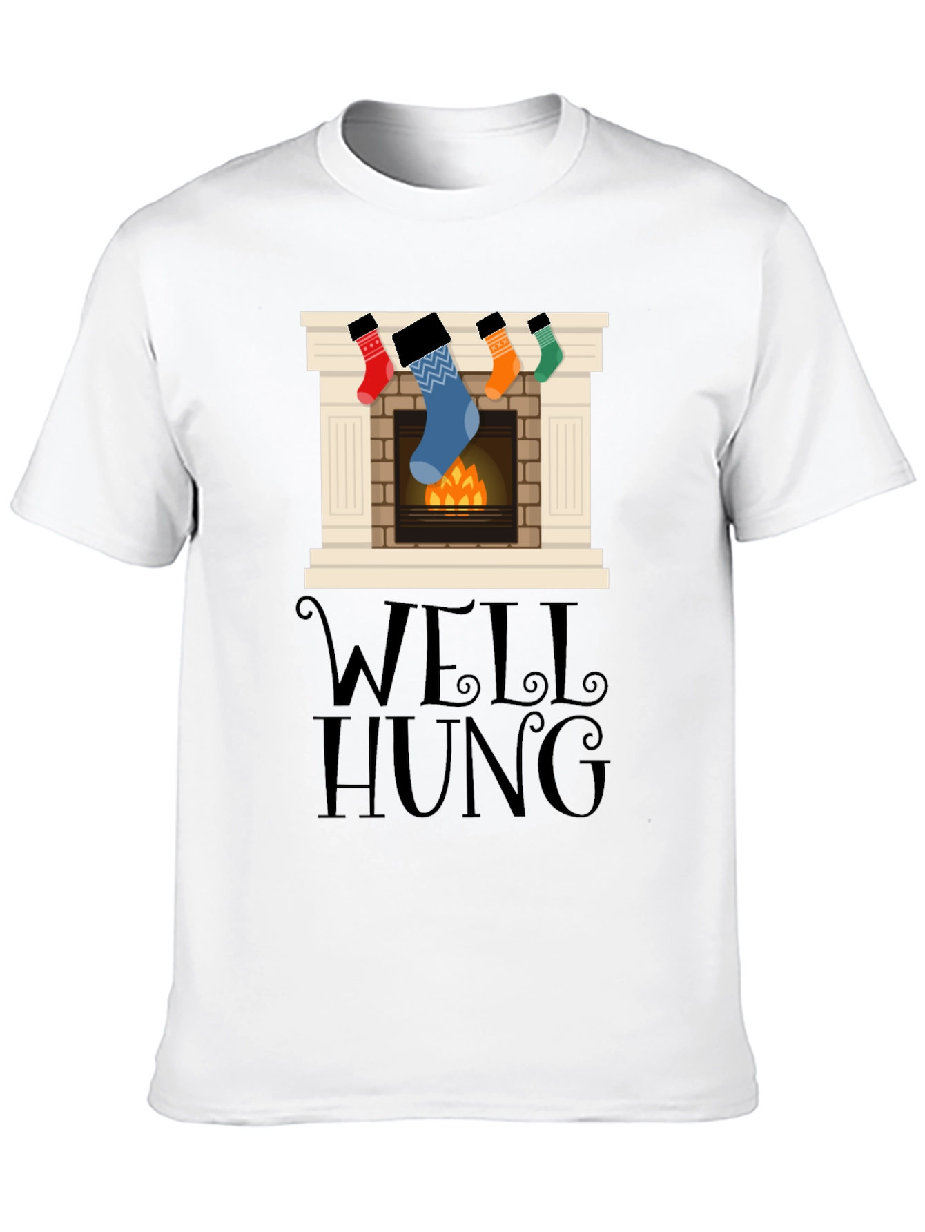 Spread holiday cheer with this eye-catching black t-shirt featuring a festive fireplace graphic. The playful design showcases stockings hung with care above a cozy fire, alongside the witty phrase "Well Hung." Crafted from soft, breathable fabric, this shirt offers both comfort and style. Perfect for holiday parties, family gatherings, or casual wear, this unique t-shirt is sure to bring smiles and start conversations. Show off your festive spirit with this must-have wardrobe addition that blends humor and holiday charm effortlessly. A fun and unique gift for the holidays!