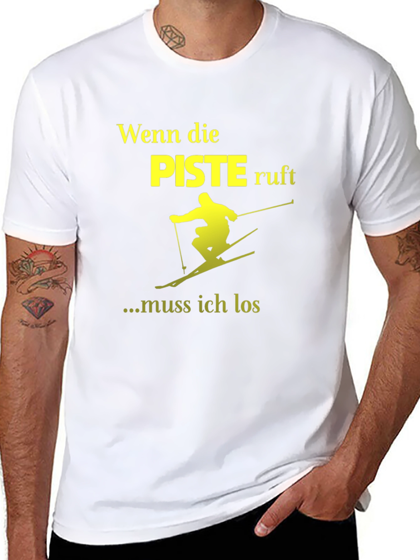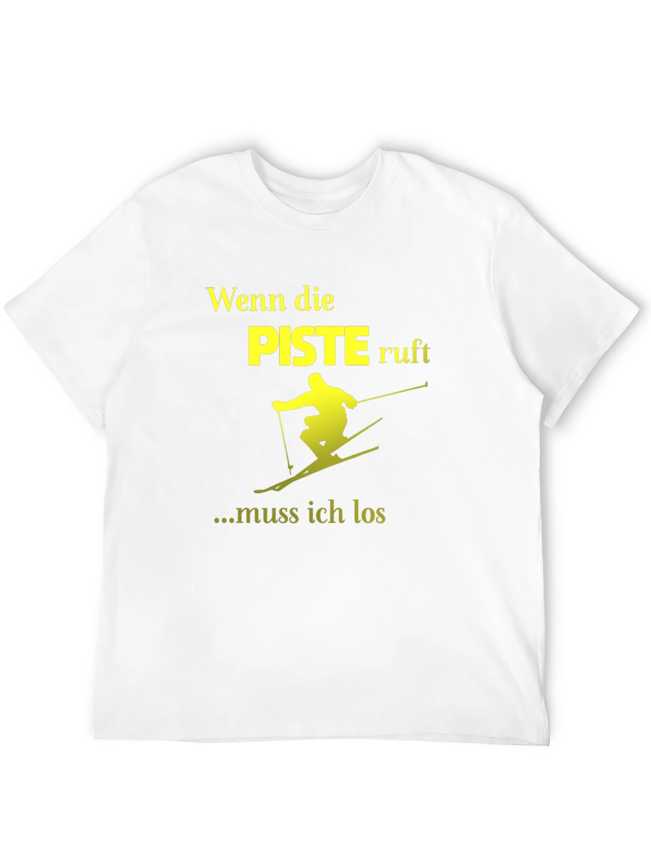 Hit the slopes in style with this fun and unique t-shirt! Featuring a bold graphic of a skier, alongside the German phrase "Wenn Die Piste Ruft... muss ich los" (When the slopes call... I must go). This shirt is perfect for any ski enthusiast. The design is printed in yellow on a classic black tee. Made from a comfortable material, this shirt is perfect for everyday wear, après-ski gatherings, or as a thoughtful gift for your favorite skier. Show off your love for skiing and German humor with this eye-catching t-shirt!
